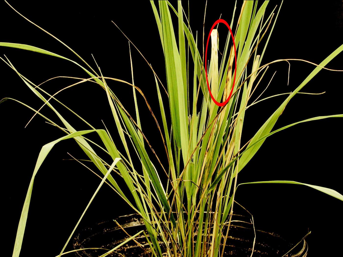 Description: Quelques feuilles basales de calamagrostide (cv 'Karl Forester') montrent des taches allongées, violacées à noires, dont le diamètre varie entre 1 et 10 mm (voir cercle). Les tests de laboratoire ont révélé la présence du champignon Colletotrichum sp., responsable de l’anthracnose. Deux espèces de Colletotrichum sont rapportées chez la calamagrostide hybride soient C. gloeosporioides et C. graminicola.