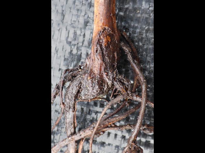 Description: Chancre noir et visqueux au niveau du collet d’un jeune plant d’argousier.