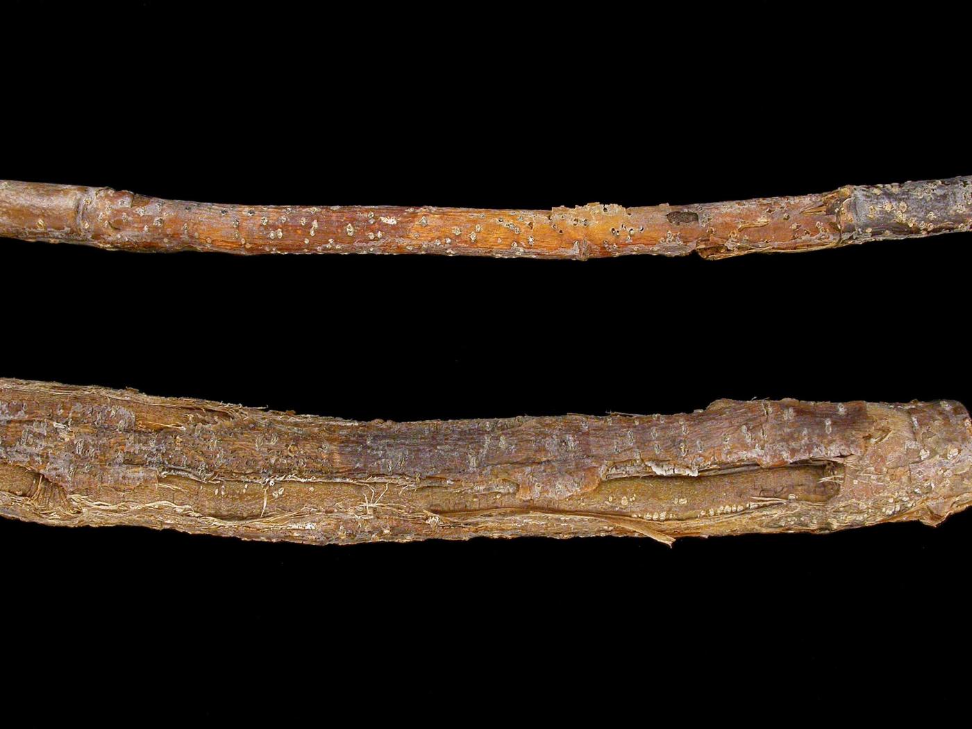 Description: Une branche de pommier montre un long chancre déprimé sur plusieurs centimètres de longueur faisant crevasser l’écorce sur tout un côté de la branche. Il y a des bourrelets de tissus cicatriciels de chaque côté de ce chancre et des pycnides noires émergent de l’écorce. Le chancre sur la tige du haut est moins développé. Les tests de laboratoire ont révélé la présence du champignon Diaporthe perniciosa (syn. Phomopsis mali), responsable du chancre phomopsien chez le pommier.