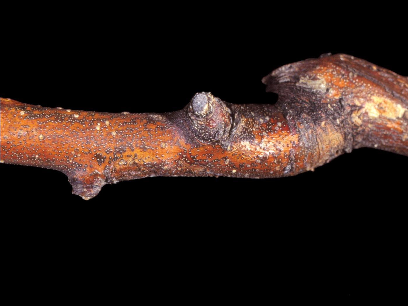 Description: Un rameau de pommier montre un chancre jaune orangé ayant tendance à avoir l’aspect d’une cible. Présence de nombreuses pycnides noires. Les tests de laboratoire ont révélé la présence du champignon Diaporthe perniciosa (syn. Phomopsis mali, responsable du chancre phomopsien chez le pommier.