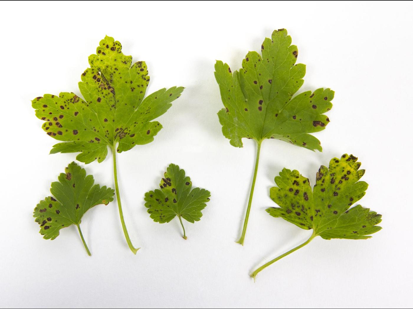 Feuille : Au début de l’infection apparaissent de minuscules taches brun foncé de forme ronde ou irrégulière. Elles sont visibles sur le dessus et le dessous de la feuille et se développent parfois aussi sur les pétioles. Généralement, elles sont assez nombreuses et peuvent atteindre de 4 à 5 mm de diamètre au fur et à mesure que l’infection progresse. Une forte pression de la maladie rend le feuillage jaune et peut entraîner une défoliation hâtive. De petites structures sphériques grises à noires se développent au centre des lésions. Ces fructifications correspondent aux structures de reproduction de Drepanopeziza ribis (acervules) et sont caractéristiques de la maladie.