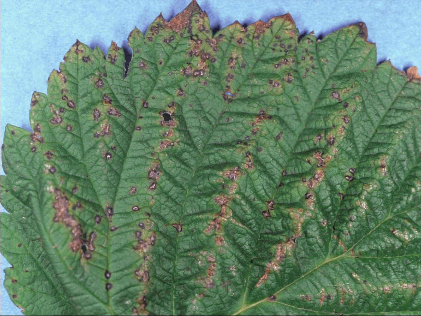 Feuille : présence de petites taches rondes de 2 à 3 mm de diamètre, avec un centre clair et une marge foncée. Les taches peuvent se dessécher et tomber. Les taches sont localisées entre les nervures principales. En effet, lorsque les feuilles de framboisier prennent de l'expansion, elles se déploient comme un accordéon à partir des nervures principales. La partie centrale située entre les nervures principales est saillante et exposée en premier aux intempéries et aux infections. Dans le cas de grave infection, il peut y avoir défoliation.