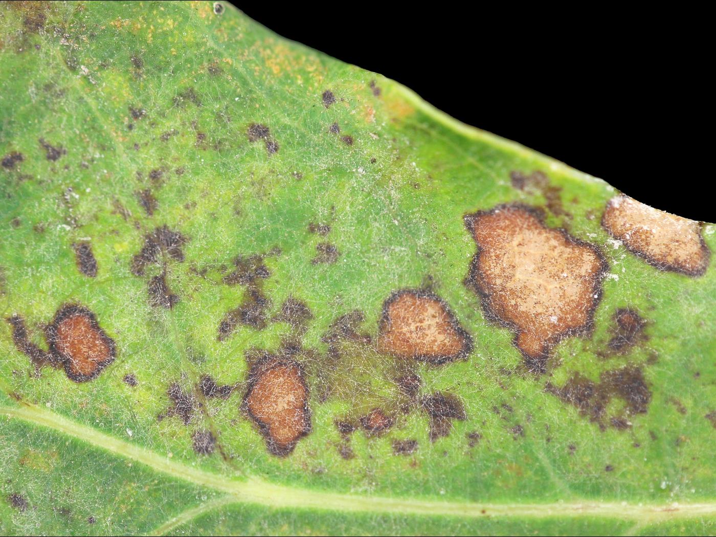 Feuille : présence d’un duvet blanc de mycélium observé à la face supérieure et inférieure. Le mycélium couvre parfois presque toute la surface foliaire. Occasionnellement, présence d’un jaunissement à brunissement du limbe, de taches ou de nécroses brunes à noires. Le blanc peut causer une défoliation précoce.