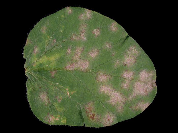 Feuille et pétiole : présence de taches verdâtres qui se couvrent de mycélium et de conidies blanc grisâtre. Affecte essentiellement la face supérieure. Couvre partiellement ou complètement la surface. Selon le cultivar, présence de taches jaunes et de nécroses entre les nervures (réaction d’hypersensibilité), taches de couleur roux, gaufrage à la marge des feuilles et défoliation.