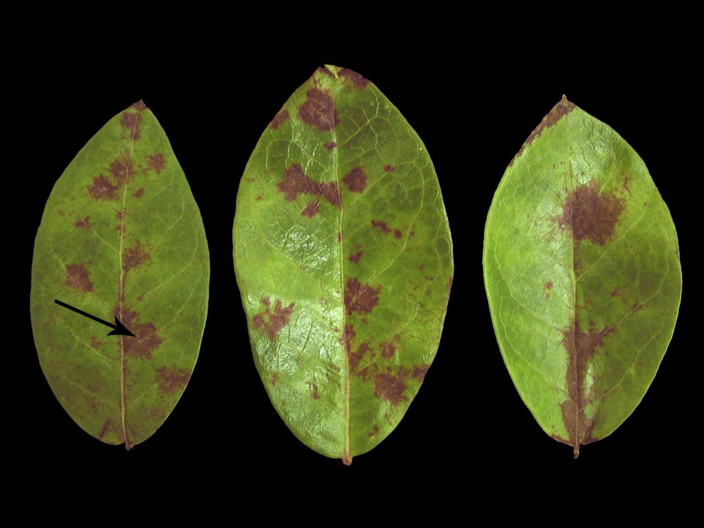 Sur les feuilles, cette maladie peut être confondue avec des taches foliaires fongiques ou virales (ex. virus de la tache annulaire rouge du bleuet (Blueberry red ringspot virus (BRRV)), mais dans ces cas, il y a absence d’un duvet blanc.