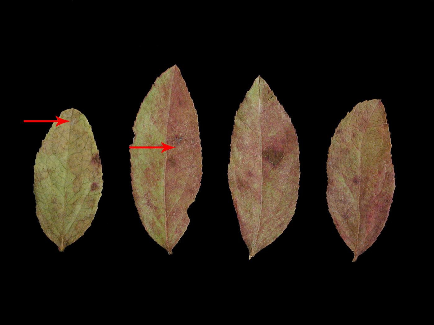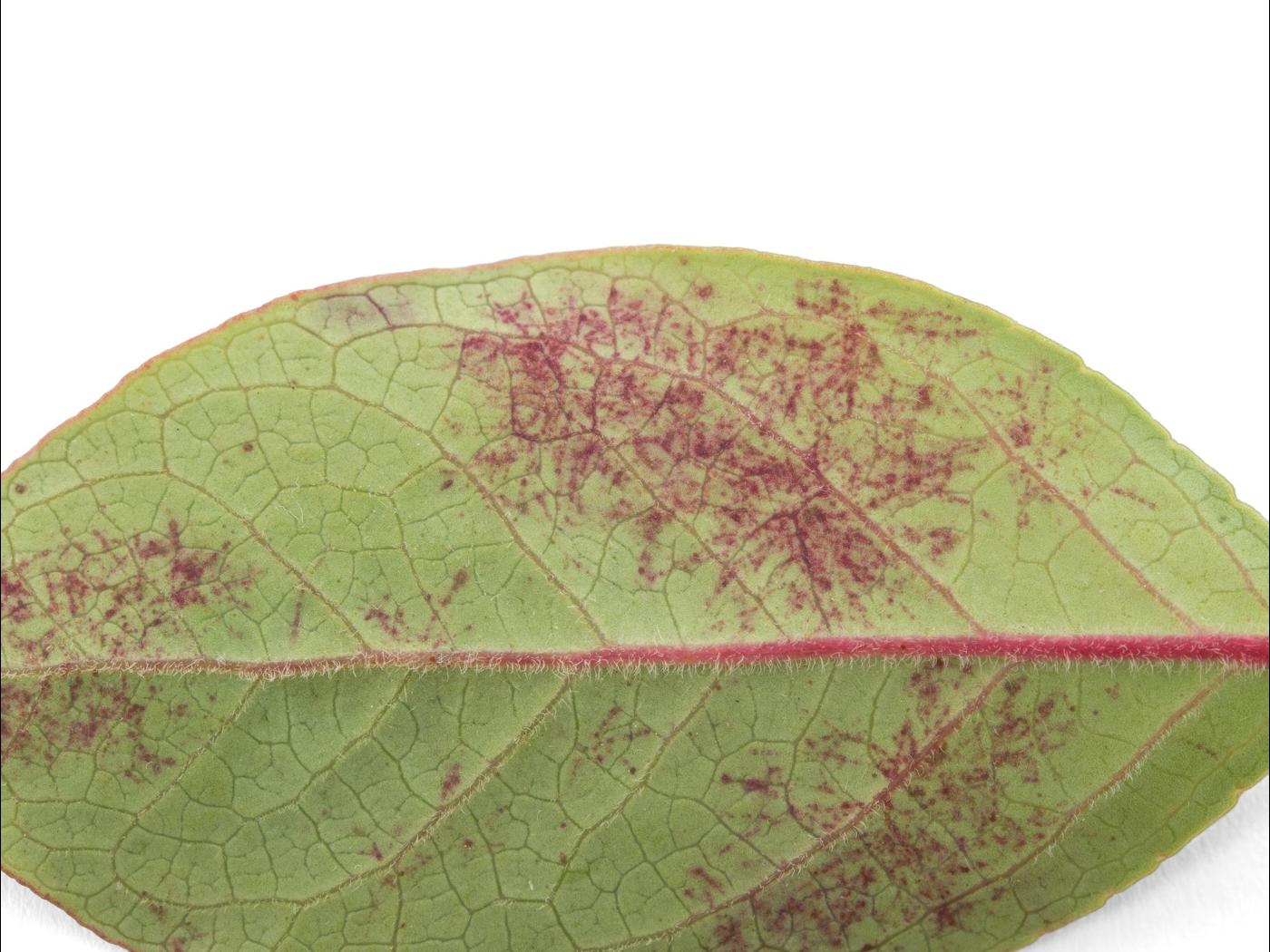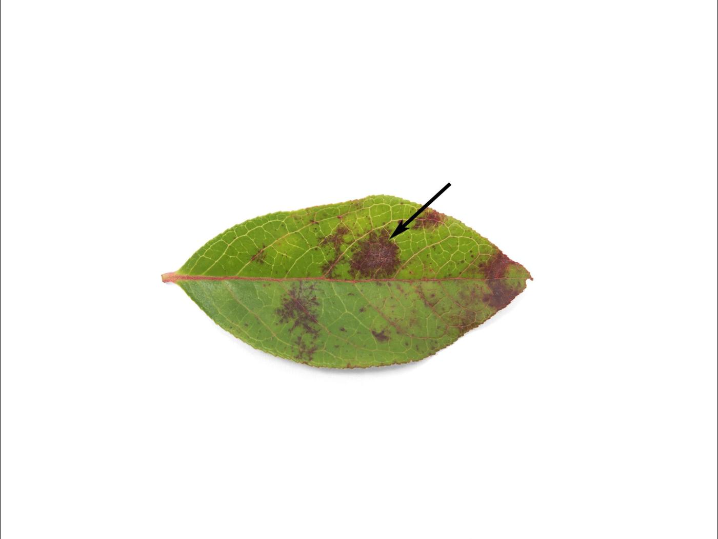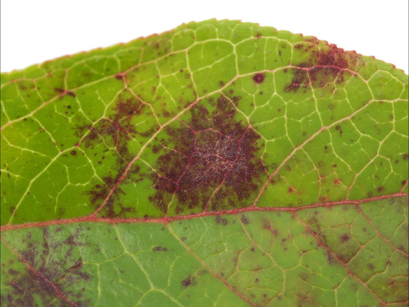 Feuille : présence de taches rouges, plutôt circulaires, à la face supérieure. Présence d’un duvet blanc de mycélium observé à la face supérieure et inférieure. La marge des feuilles peut s’enrouler en forme de cuillère. Les feuilles rougissent et chutent prématurément. Parfois présence de taches jaunes avec une marge rouge.