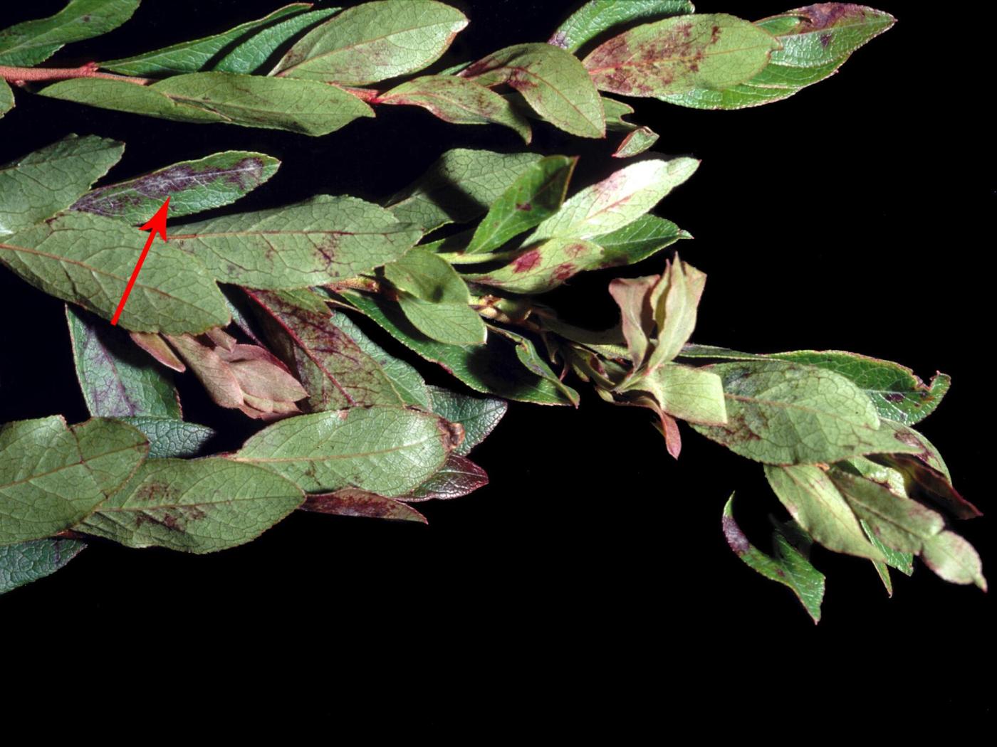 Feuille : Présence de taches rouges plutôt circulaires à la face supérieure. Présence d’un duvet blanc de mycélium observé à la face supérieure et inférieure. La marge des feuilles peut s’enrouler en forme de cuillère. Les feuilles rougissent et chutent prématurément. Parfois présence de taches jaunes avec une marge rouge.