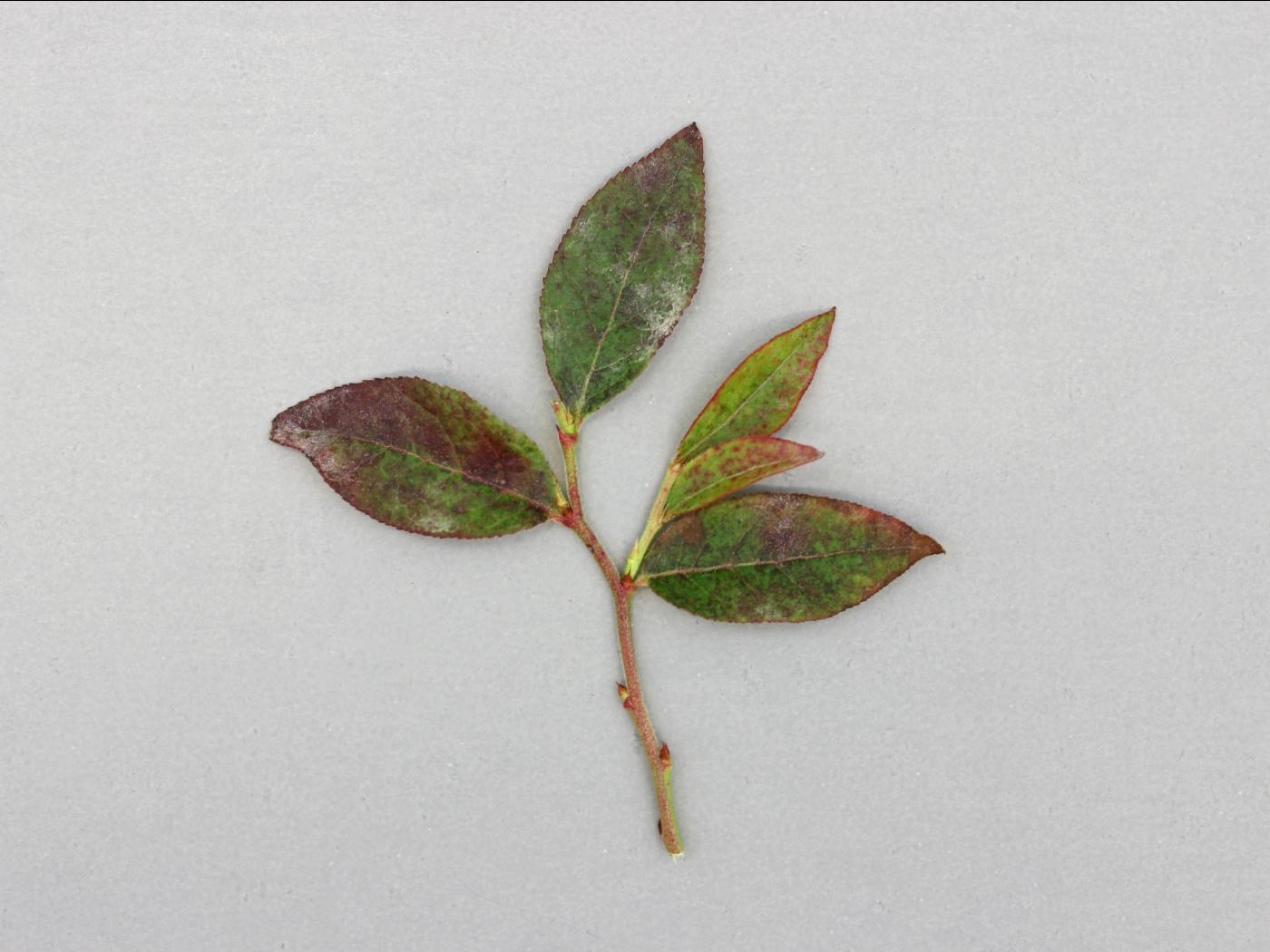 Sur les feuilles, cette maladie peut être confondue avec des taches foliaires fongiques ou virales (ex. virus de la tache annulaire rouge du bleuet (Blueberry red ringspot virus (BRRV)), mais dans ces cas, il y a absence d’un duvet blanc.