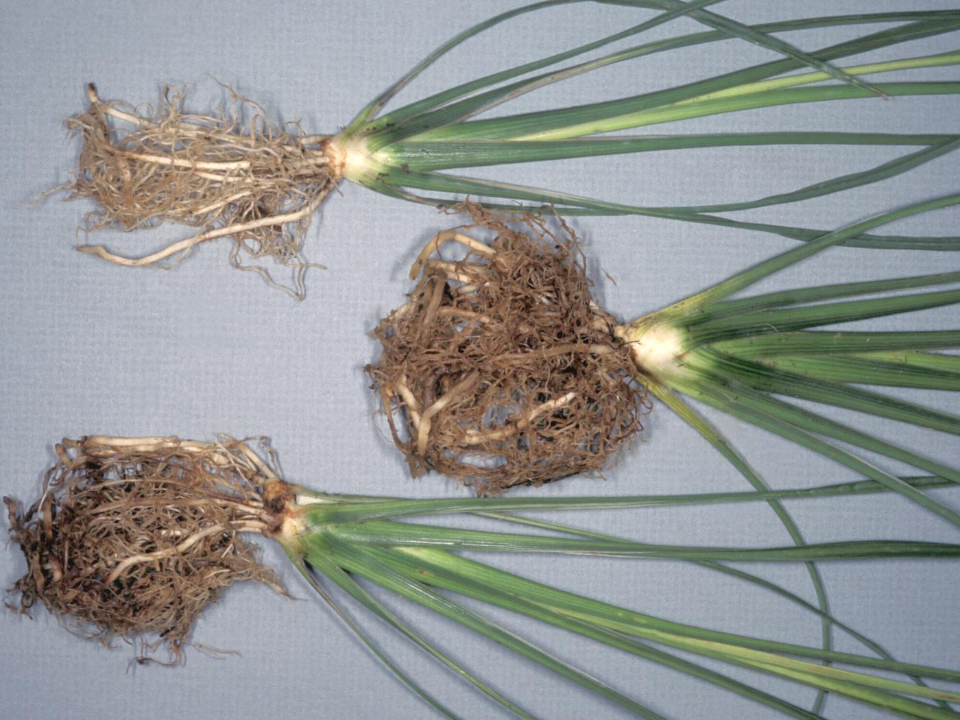 Légende: Faible développement, brunissement et pourriture des racines de dracéna