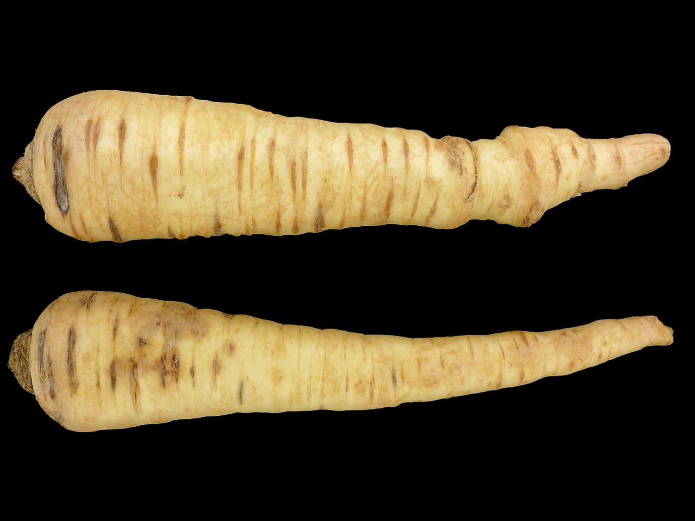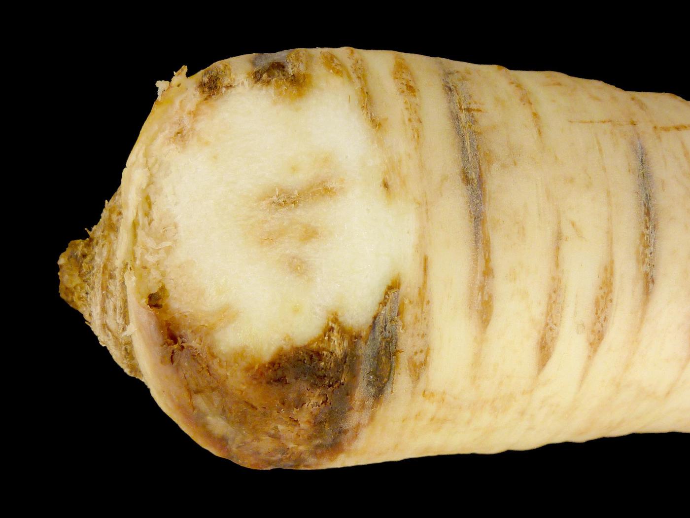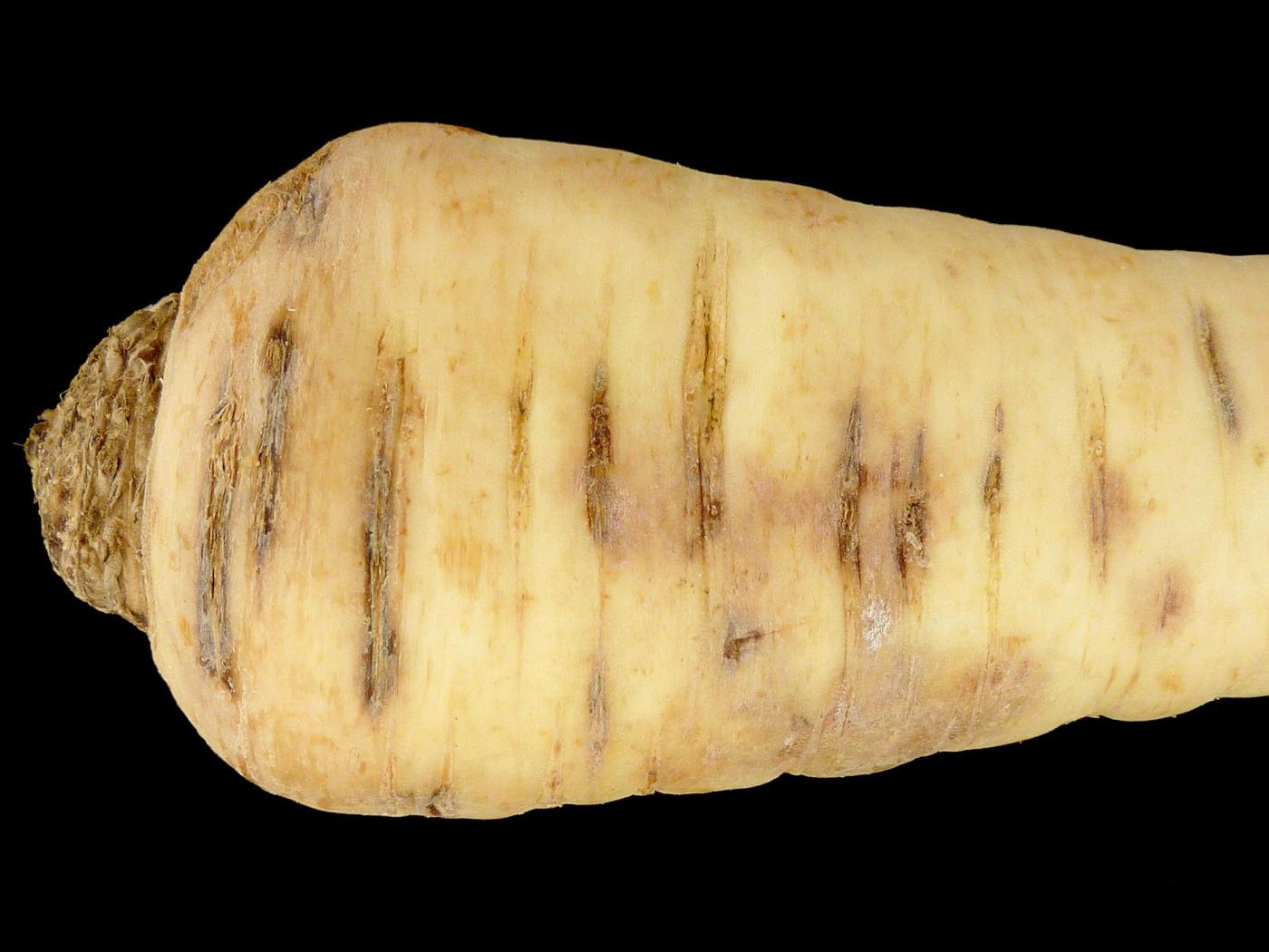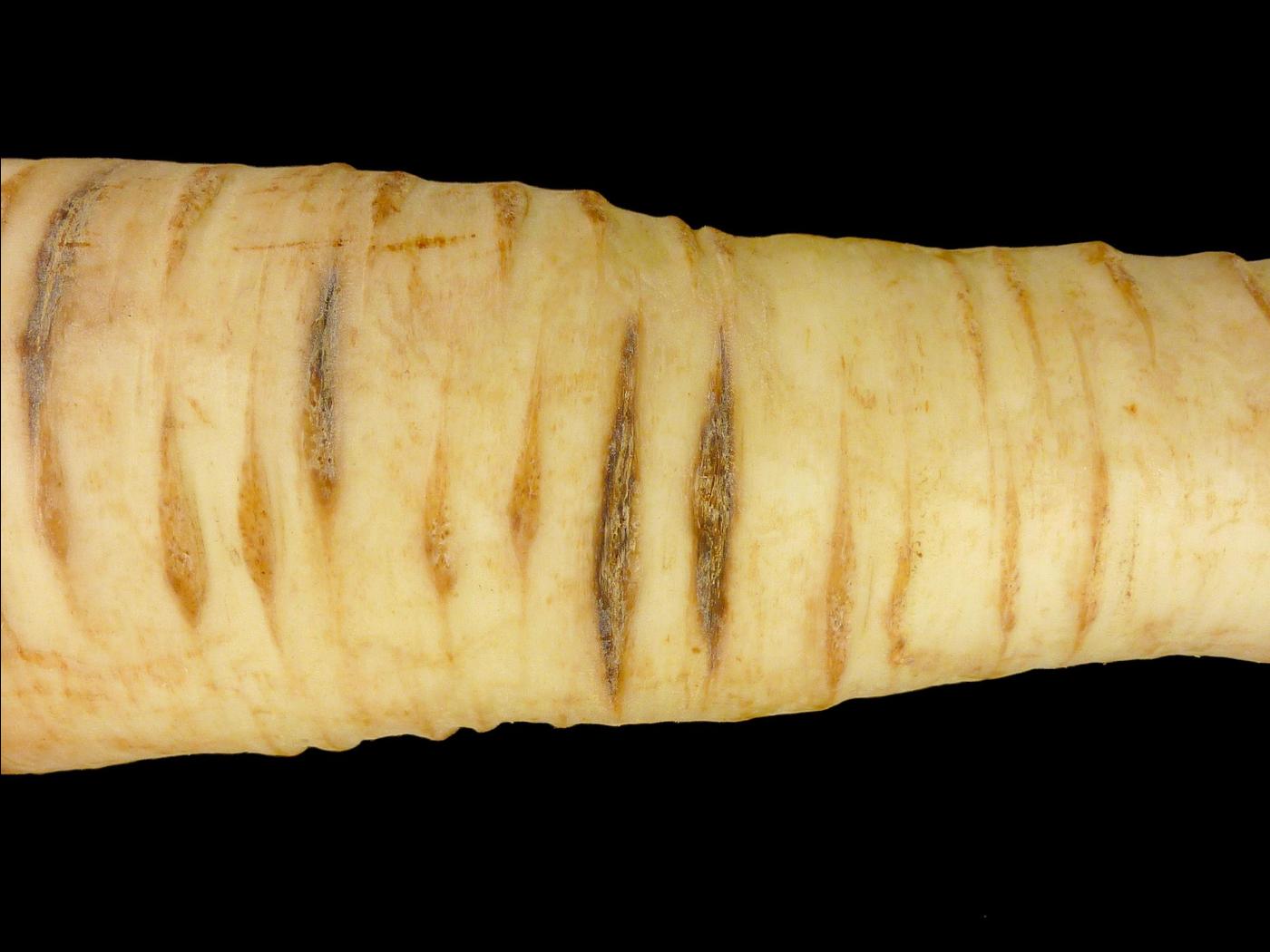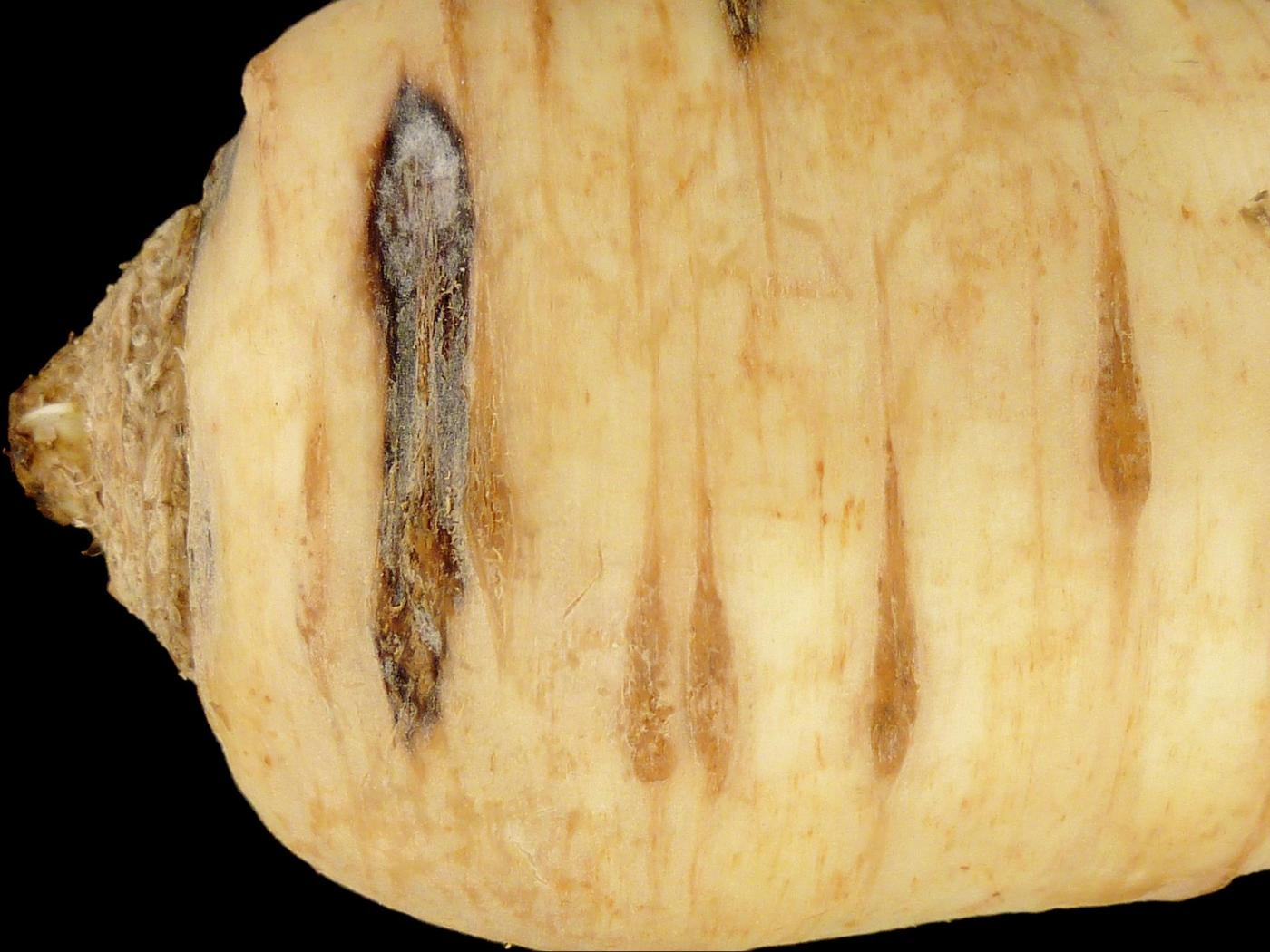 Description: Dans la partie supérieure d’un panais provenant d’un entrepôt, présence de lésions brunes à noires, de forme allongée, sur les lenticelles. Le dommage pénètre dans la chair. Les tests de laboratoire ont révélé la présence du champignon Itersonilia perplexans, responsable du chancre à Itersonilia chez le panais.