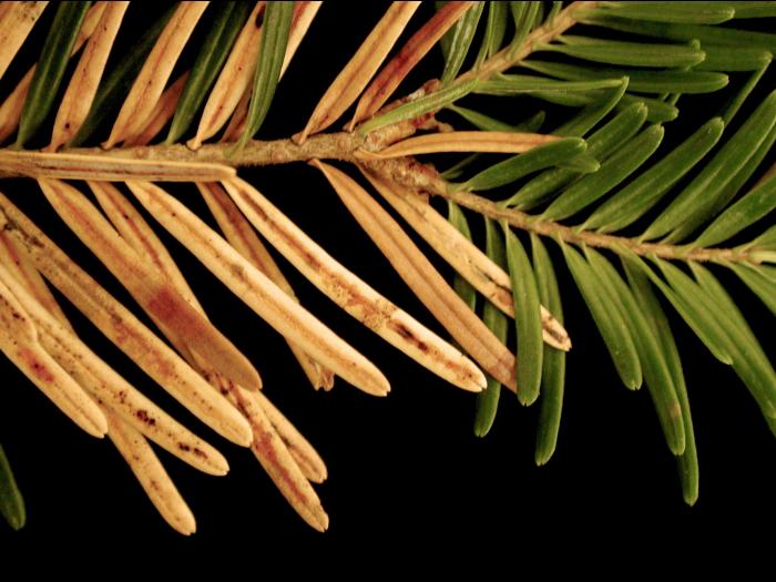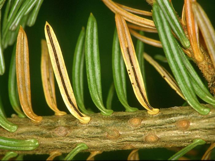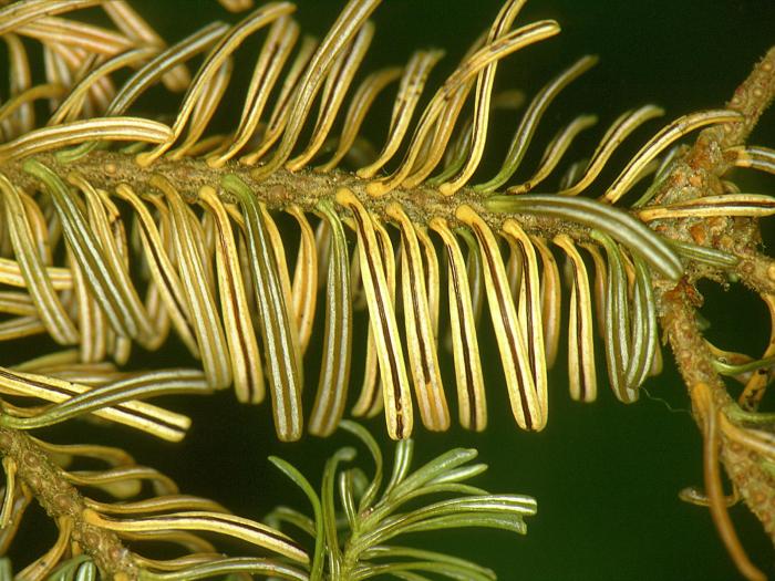 Généralement, les dégâts s’observent d’abord au bas de l’arbre et progressent ensuite vers le haut. Lorsque l’infection progresse au fil des ans, la partie des branches près du tronc (partie proximale) se dénude et l’arbre prend une apparence clairsemée. Après 3 à 4 années consécutives de graves infections, les branches peuvent potentiellement mourir lorsque les vieilles aiguilles tombent au sol chaque année.