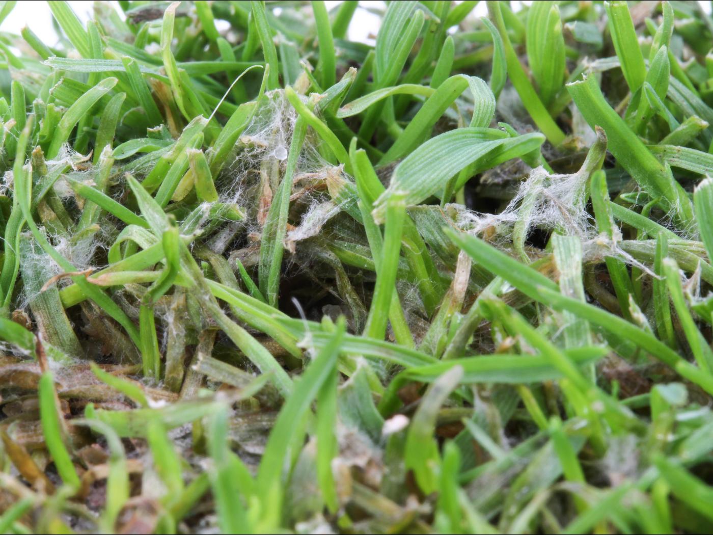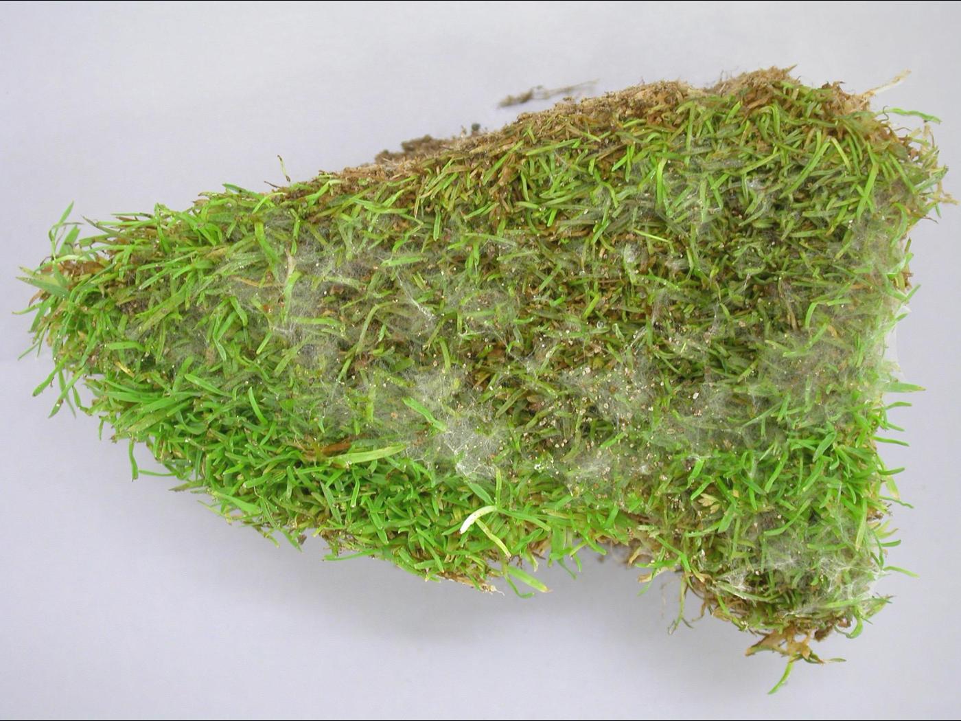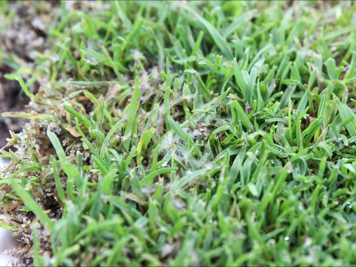 Légende: Dépérissement et mycélium blanc sur gazon