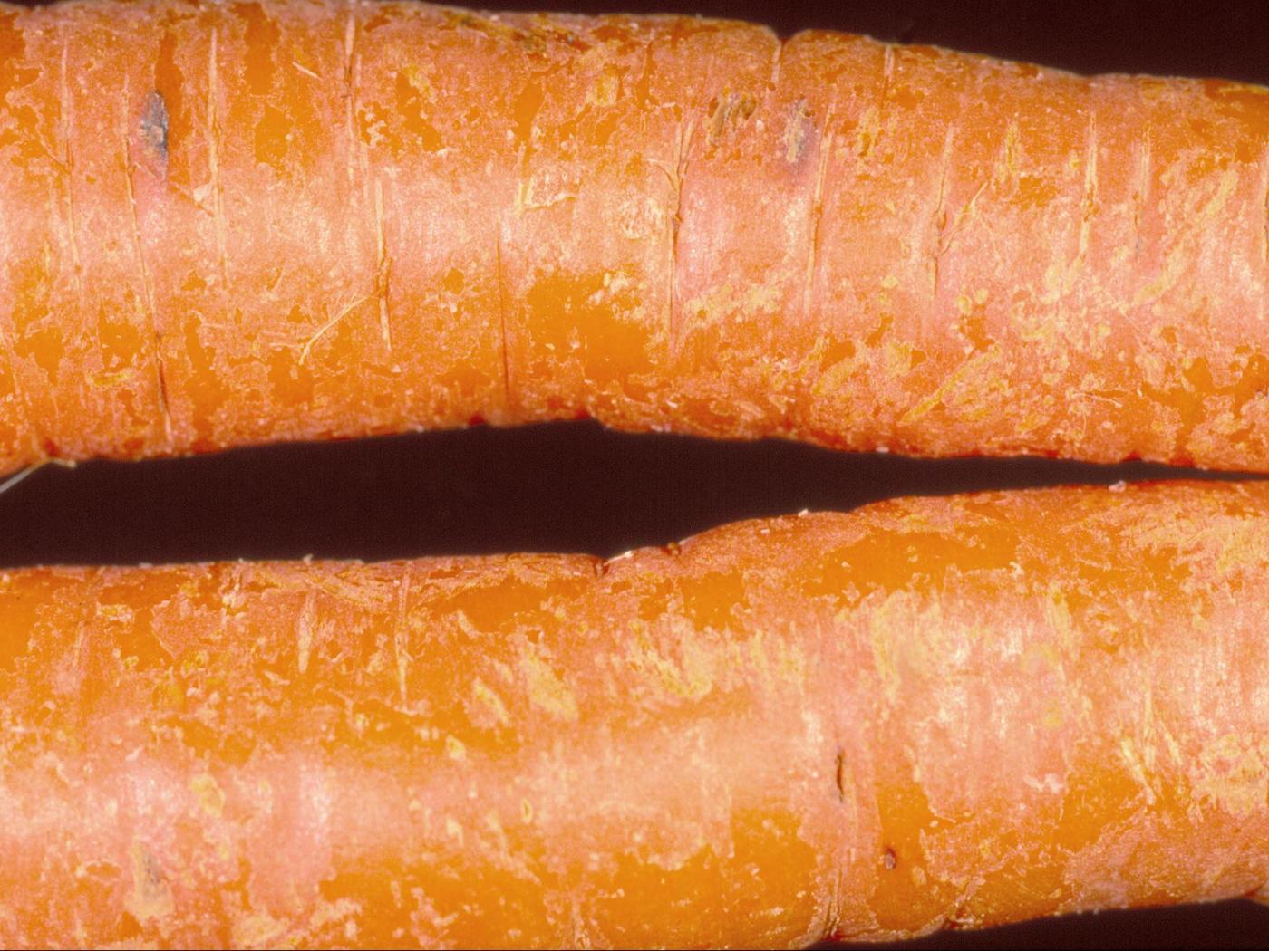 Description: Sur des carottes provenant d’un entrepôt, présence de taches ou de lésions fermes, noires, rondes à elliptiques et déprimées. La chair sous-jacente est atteinte assez profondément. Les tests de laboratoire ont révélé la présence du champignon Mycocentrospora acerina, responsable de la pourriture à Mycocentrospora.