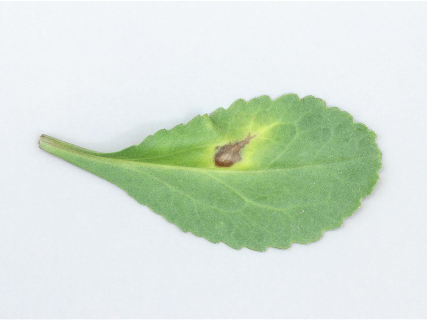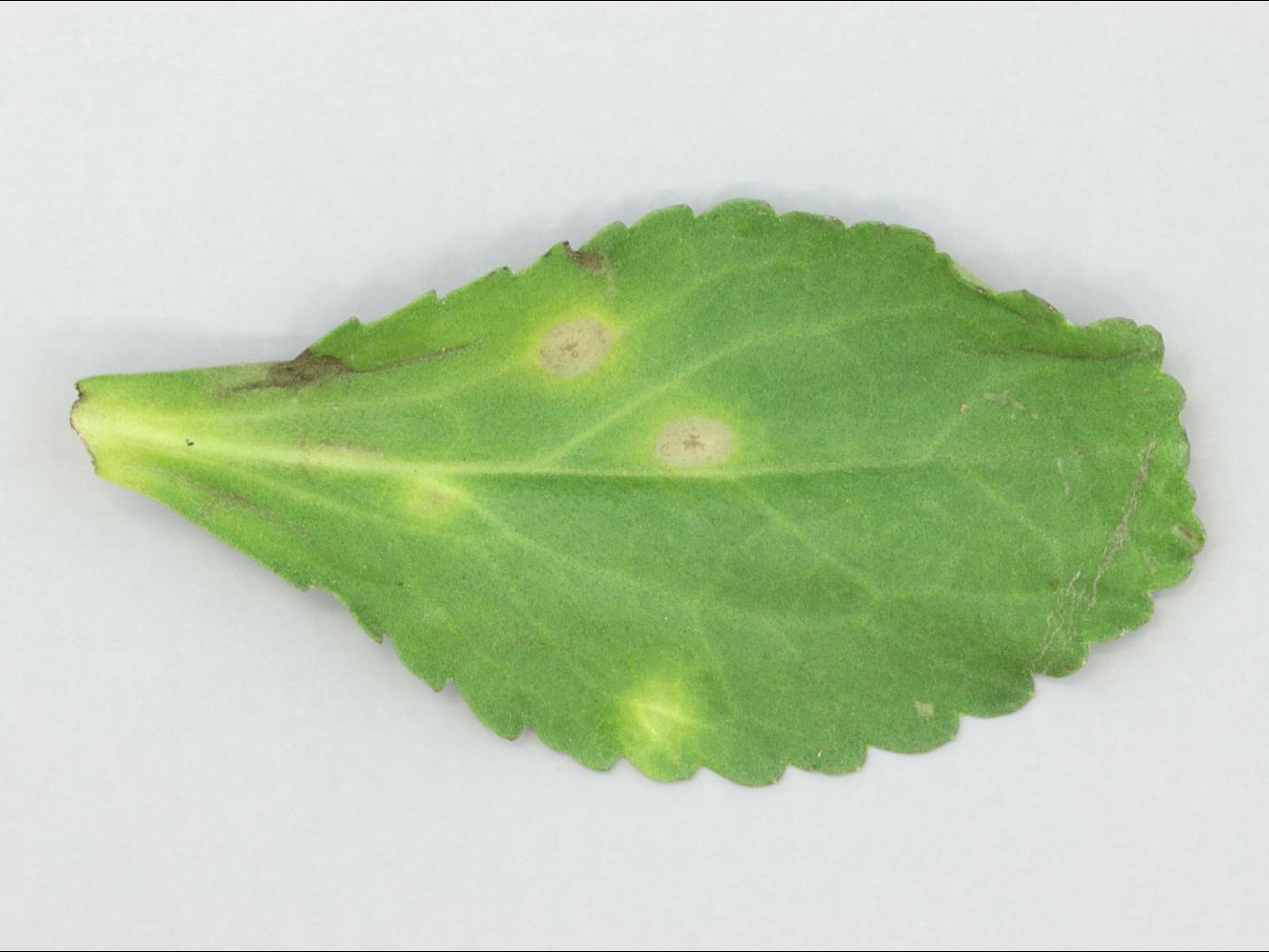 Description: Les feuilles de marguerites cultivées en serre montrent des taches de différente nature selon leur stade de développement. Les taches semblent débuter par l'apparition d'un halo jaune. Un brunissement apparaît ensuite au centre de ce halo. Certaines taches de plus grandes dimensions sont beiges à brunes, sèches et ne portent pas de halos jaunes (non visibles ici). Les taches sont présentes sur les trois niveaux de feuille. Les tests de laboratoire ont révélé la présence du champignon Myrothecium… En savoir plus