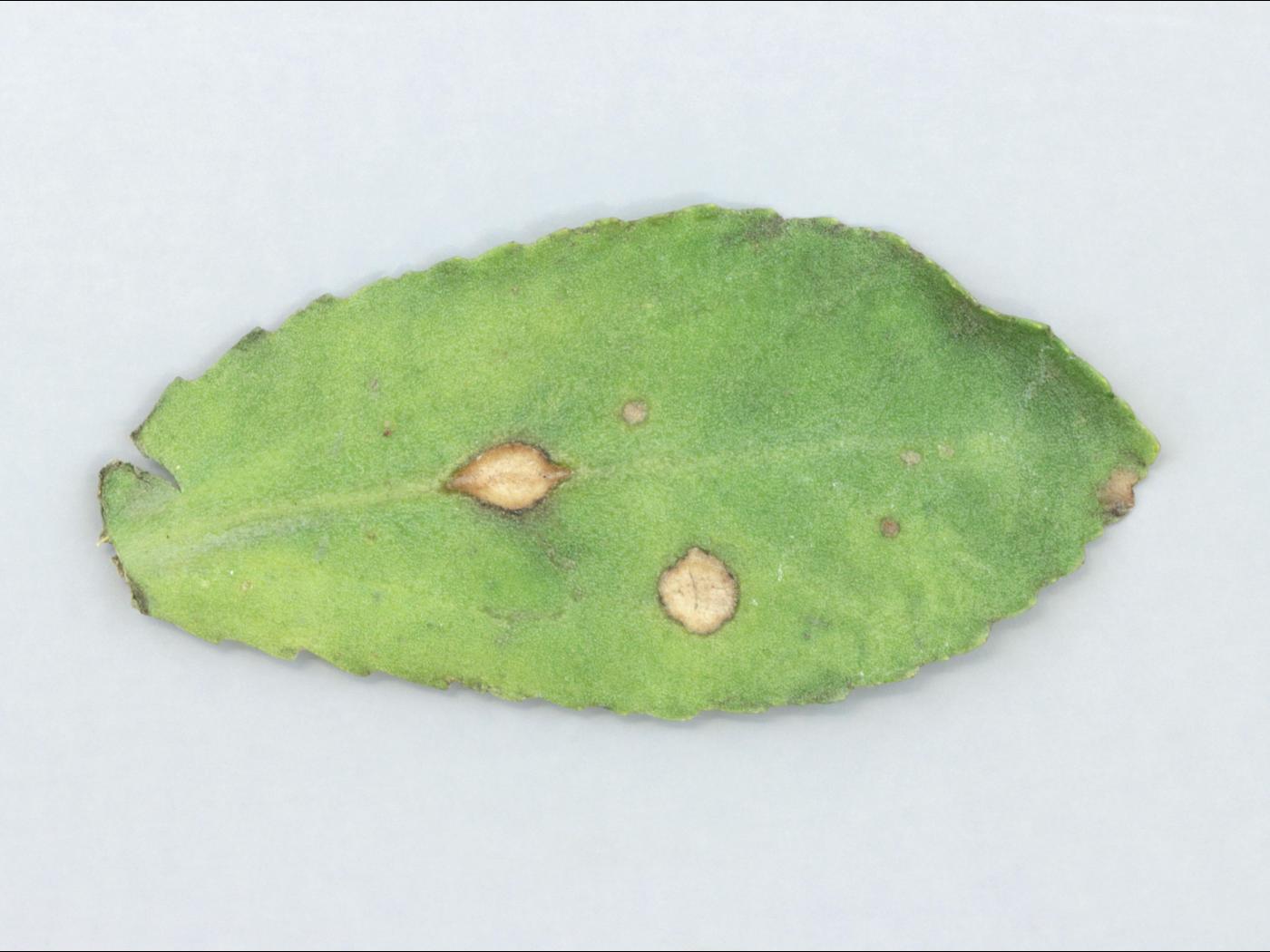 Description: Les feuilles de marguerites vivaces cultivées en serre montrent des taches de différente nature selon leur stade de développement. Les taches semblent débuter par l'apparition d'un halo jaune puis un brunissement apparaît ensuite au centre de ce halo (non visible ici). Certaines taches de plus grandes dimensions sont beiges à brunes, sèches et ne portent pas de halos jaunes. Les symptômes observés à la face inférieure de ces dernières taches sont similaires et un mycélium blanc est visible. Les … En savoir plus
