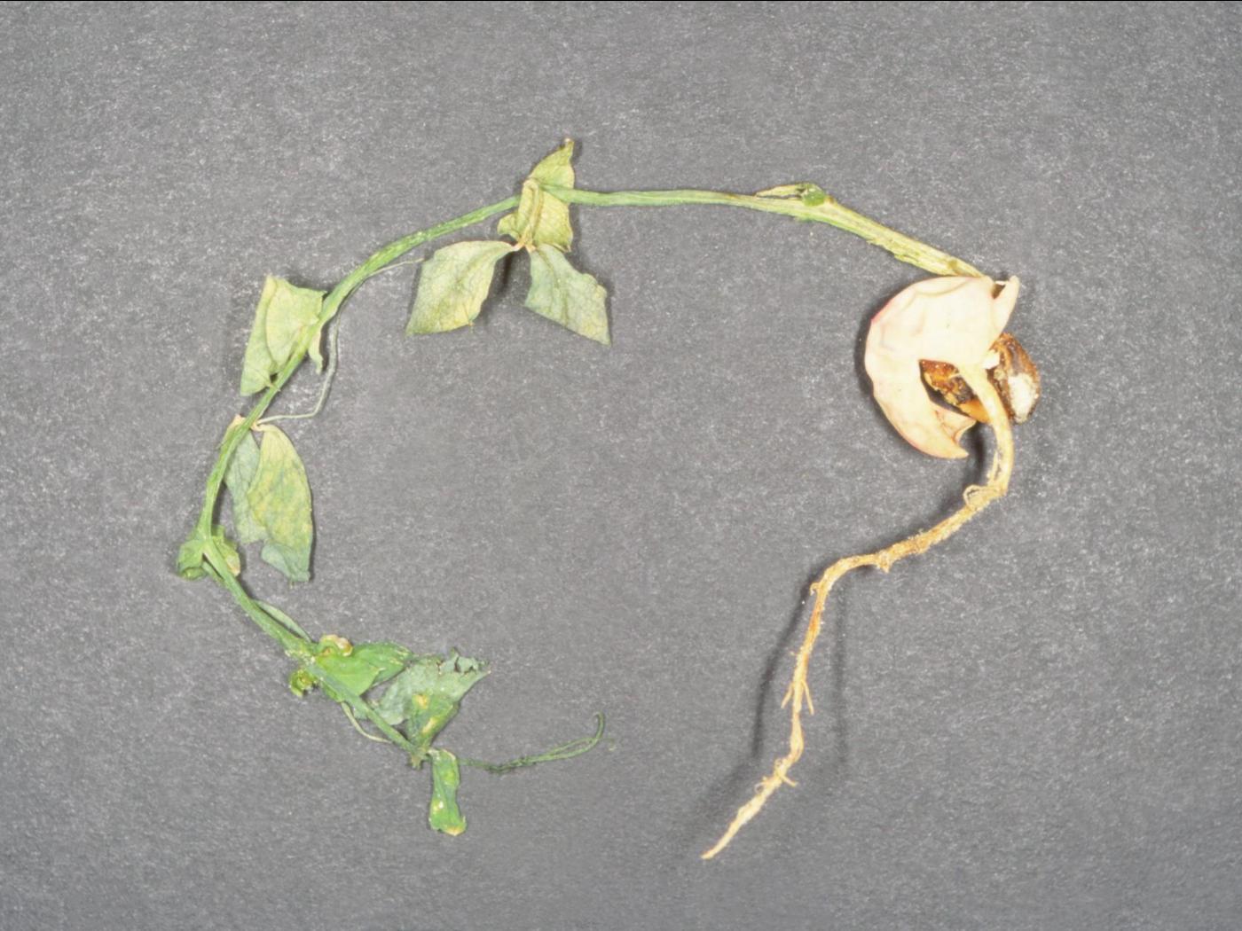 Description: Une plantule de pois montre une pourriture sèche brune des racines et un feuillage jauni et fané. Les tests de laboratoire ont révélé la présence du champignon Fusarium solani, responsable de la pourriture fusarienne des racines chez le pois. Il s’agit probablement de F. solani f. sp. pisi.
