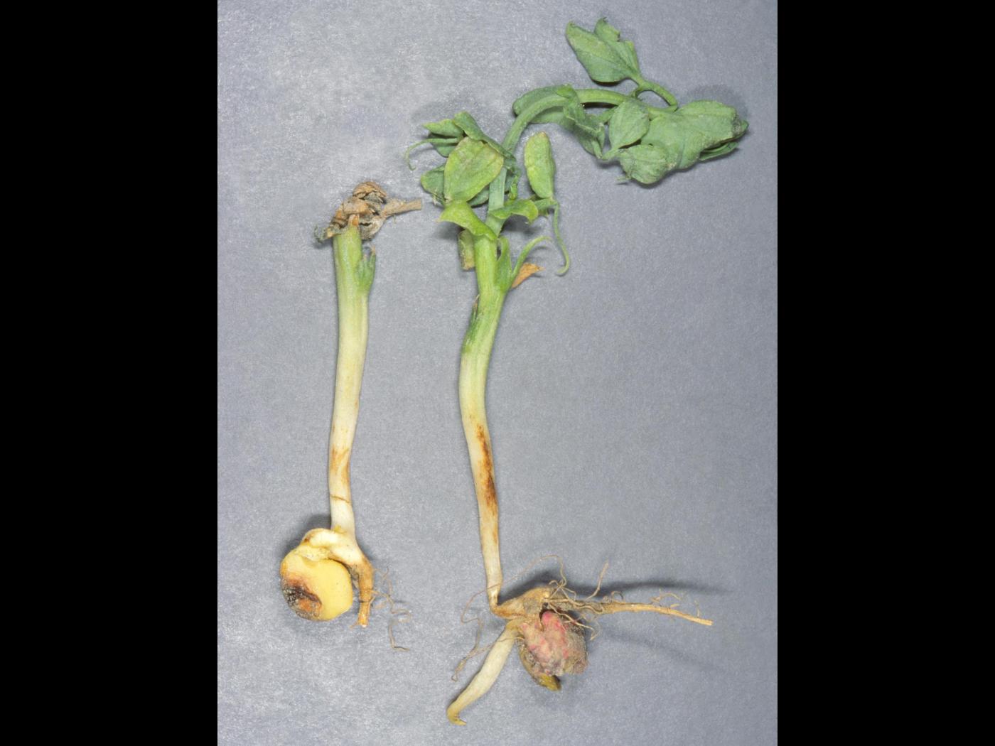 Plantule : le champignon infecte d’abord la zone de fixation des cotylédons puis l’épicotyle souterrain, l’hypocotyle et la partie supérieure de la racine pivot. L’infection s’étend ensuite vers le haut jusqu’à la ligne de sol ou vers le système racinaire. La racine pivot et les racines secondaires portent des lésions brun rougeâtre à brun noirâtre qui se regrouper en cours de saison pour former une longue lésion noirâtre. Les racines secondaires sont habituellement les plus affectées et sont moins nombreuses. Généralement, le cortex racinaire s’enlève facilement et révèle un système vasculaire habituellement sain. Les feuilles sont faiblement développées et jaunes. Des nécroses peuvent se développer sur les feuilles basales. Les dommages débutent sur les feuilles basales puis progressent vers les jeunes feuilles. Les plantules sont parfois rabougries et leur maturité est précoce.