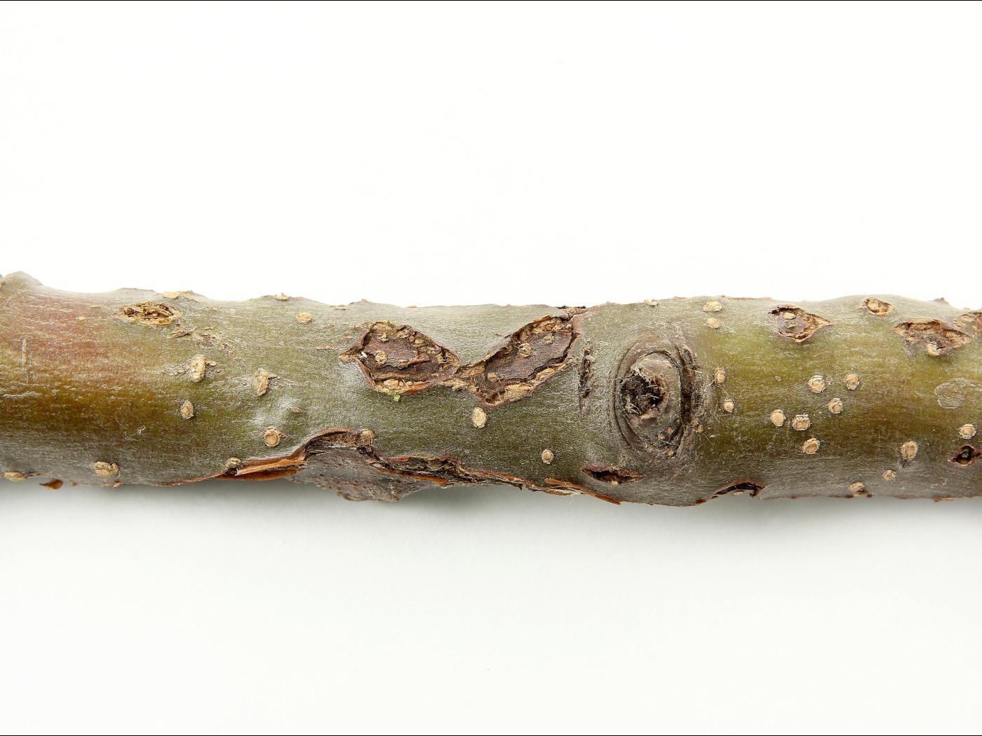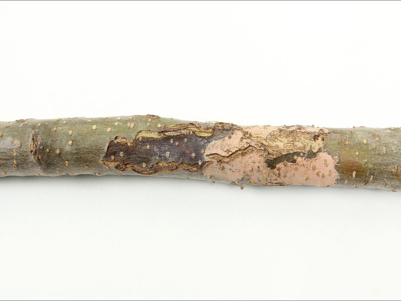Branche et tronc : au début, présence de petites taches brun rougeâtre et déprimées sur les pousses annuelles et les rameaux d’un an. Le tissu cambial sous l’écorce meurt progressivement et l’écorce adjacente au cambium infecté s’enfonce, change de couleur et se fissure, causant une démarcation nette entre les tissus sains et affectés la première année. Les chancres deviennent alors apparents. Les années subséquentes, il n’y a plus de démarcation franche entre les tissus sains et affectés et le chancre est entouré d’anneaux cicatriciels de plus en plus gros. L'écorce détruite laisse le bois nu au centre du chancre. Lors de conditions humides, les jeunes chancres montrent des fructifications asexuées blanchâtres (conidies) et sur les chancres plus âgés, des fructifications sexuées orange vif (périthèces) sont produites. À maturité, les fructifications sont rouges puis deviennent noires avec l’âge. Les chancres sont souvent concentrés sur les petites branches et il peut y avoir plusieurs chancres par arbre.