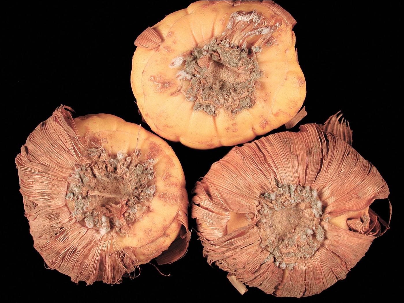 Corme : absence de production de feuilles ou production de feuilles jaunes lorsque les cormes sont affectés. En entrepôt, lors de conditions humides, la pourriture apparait sous la forme de taches superficielles, pâles, humides et molles. Elles sont de différentes grosseurs et formes et sont distribuées aléatoirement sur les tissus. Occasionnellement, présence d’une coloration rouge à brune du corme. Les taches deviennent profondes et le dépérissement est rapide. Les taches sont constituées d’un mycélium blanc sur lequel des spores de différentes couleurs (bleue, bleu-vert, vert à vert olive) apparaissent au centre. Un halo humide entoure les taches. Lors de conditions sèches, les cormes sont ratatinés et momifiés. En de rares occasions, le corme meurt, généralement de concert avec d'autres champignons ou bactéries.