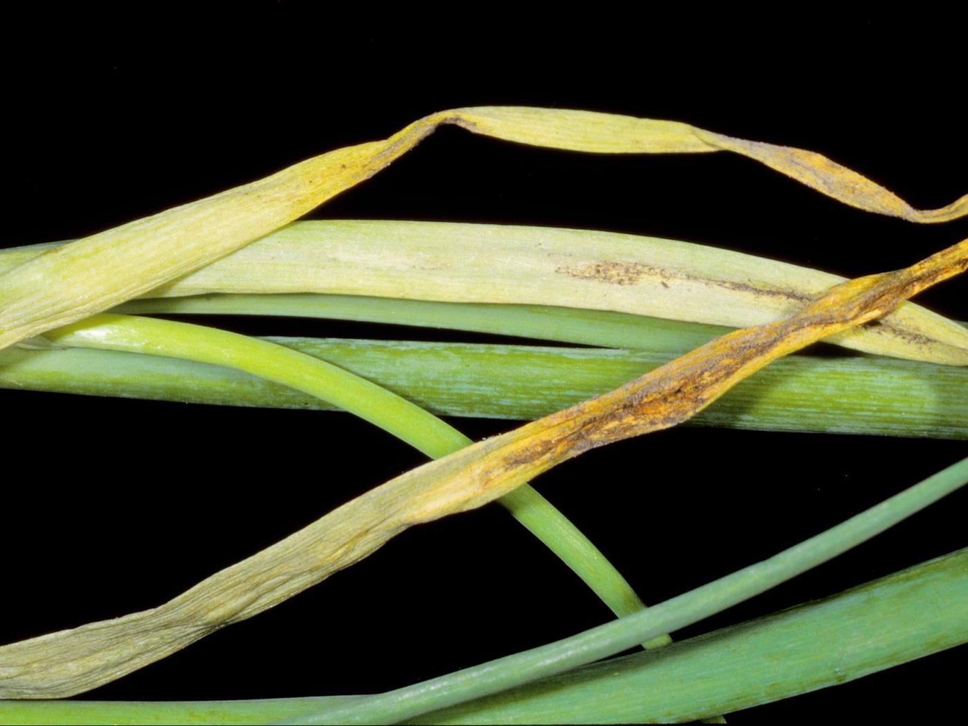 Légende: Jaunissement et sporulation grisâtre sur feuilles d'oignon sec