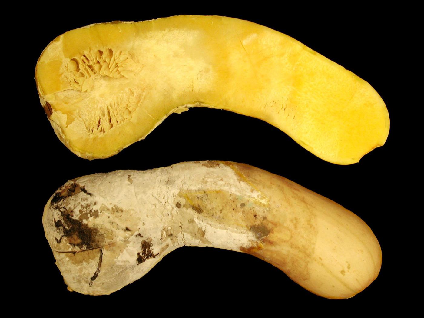 Description: Une courge musquée ('Butternut') a été coupée en deux. Sur la partie au bas de l’image, l’épiderme du fruit présente de grandes zones d’une pourriture mi - ferme à molle et une croissance mycélienne blanchâtre et dense. Sous l'épiderme, la chair est aqueuse et translucide (partie du haut). Une forte odeur acidulée émanait de la pourriture. Les observations microscopiques ont révélé la présence d’un mycélium non septé et de sporanges caractéristiques de Phytophthora capsici, responsable du dépéri… En savoir plus
