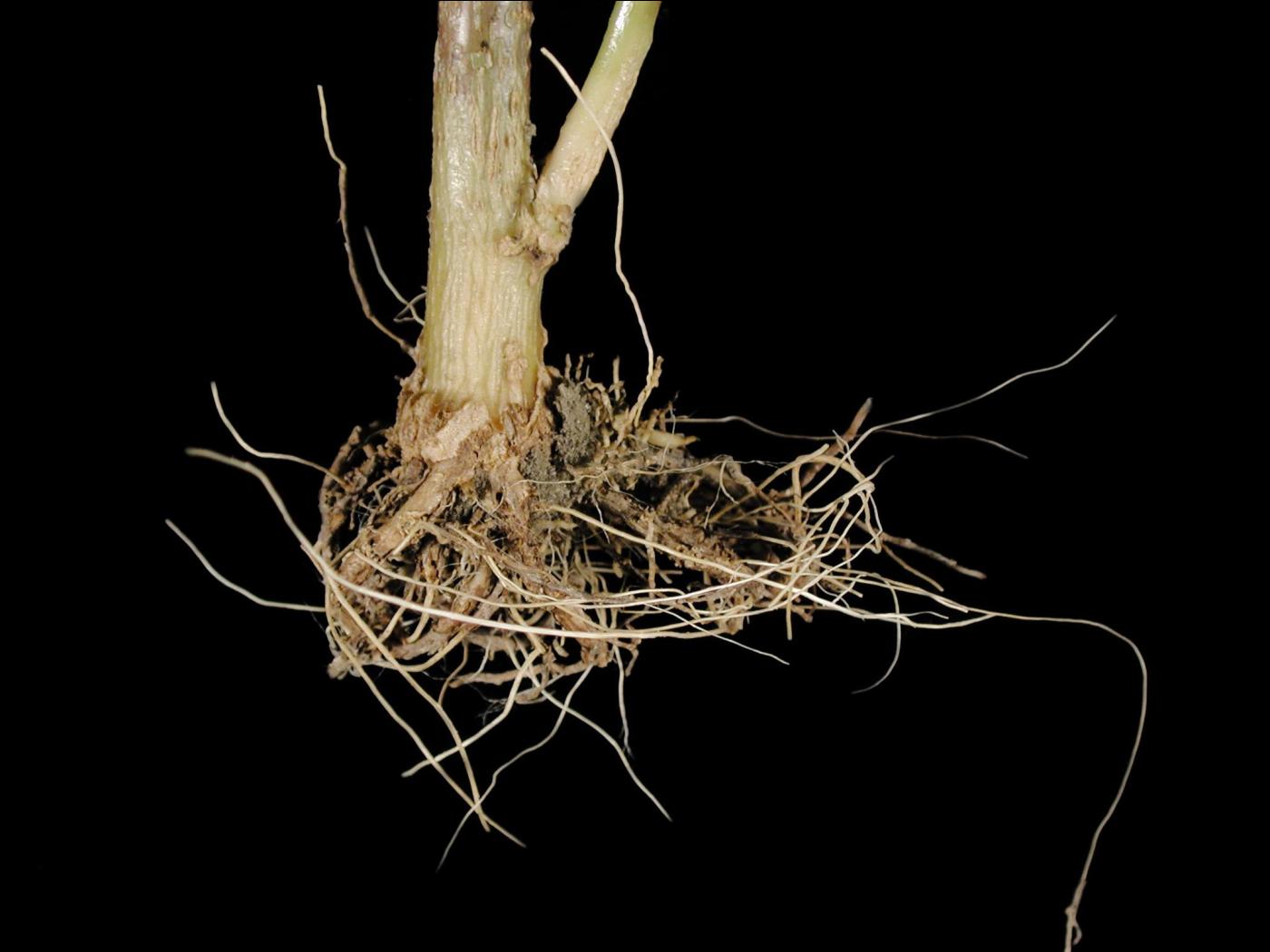 Description: Les racines d’un poinsettia sont pourries, brunes et le cortex se détache facilement. De petites stries longitudinales beiges sont visibles dans la partie basale de la tige. Les tests de laboratoire ont révélé la présence du champignon Phytophthora sp. dans les racines. Chez le poinsettia, P. nicotianae est l’espèce la plus fréquemment rapportée.