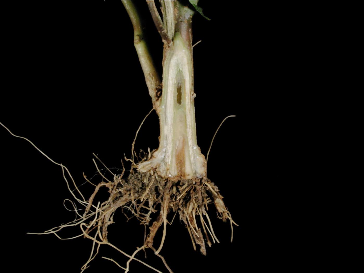Description: Les racines d’un poinsettia sont pourries, brunes et le cortex se détache facilement. Une coupe longitudinale de la tige révèle un brunissement qui débute au collet et qui progresse dans la moelle de la tige. Les tests de laboratoire ont révélé la présence du champignon Phytophthora sp. dans les racines. Chez le poinsettia, P. nicotianae est ll'espèce la plus fréquemment rapportée.