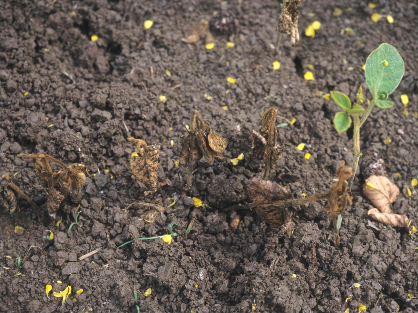 Description: Des plants de soya sont dépéris et faiblement développés. La partie basale de la tige est brune (peu visible ici). Les feuilles sont brunes, affaissées, mais demeurent attachées au plant. Ces symptômes sont caractéristiques de la pourriture phytophthoréenne, causée par Phytophthora sojae.