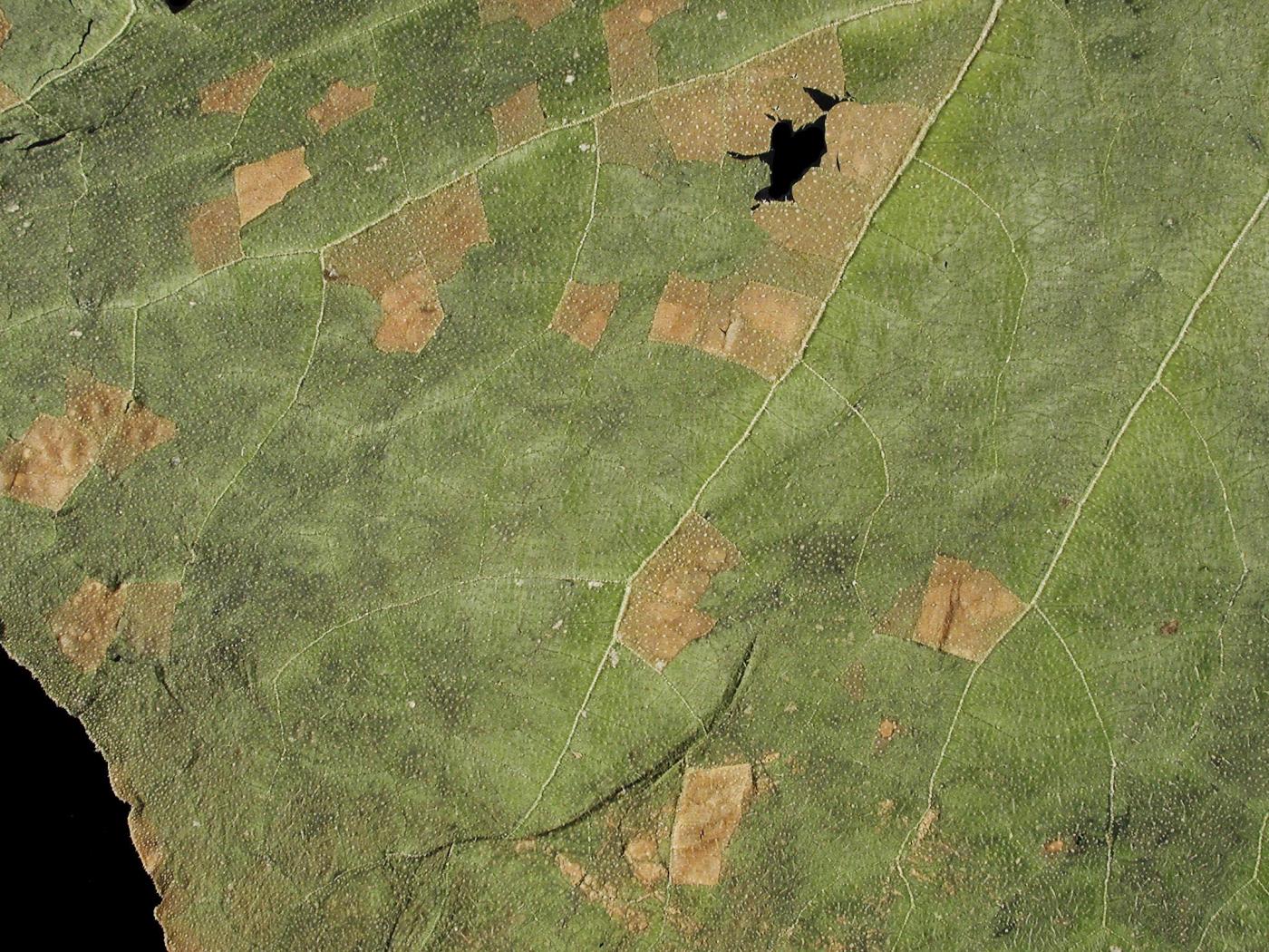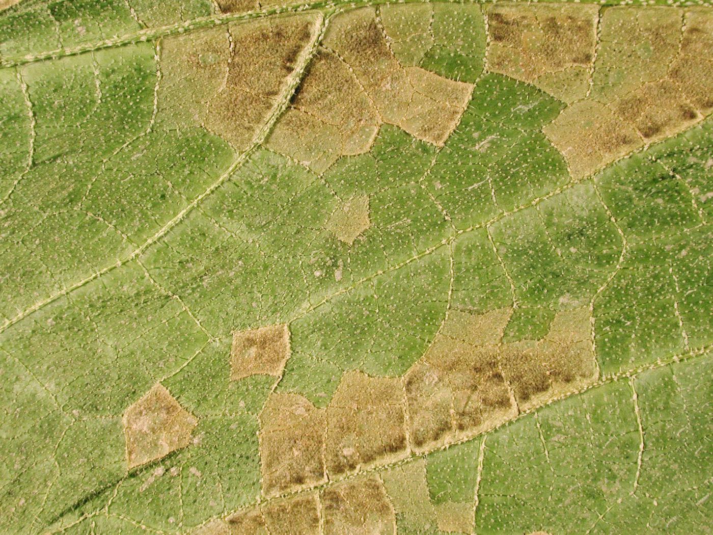 Feuille : à la face supérieure, les taches sont initialement jaunes et angulaires, puis deviennent brunes et peuvent former de larges plages brunes qui finissent par faire mourir les feuilles. À la face inférieure, les taches sont brunes et se couvrent de sporanges de P. cubensis, conférant une teinte brun-violacé au limbe. Les infections débutent toujours sur les vieilles feuilles et progressent vers les jeunes feuilles.