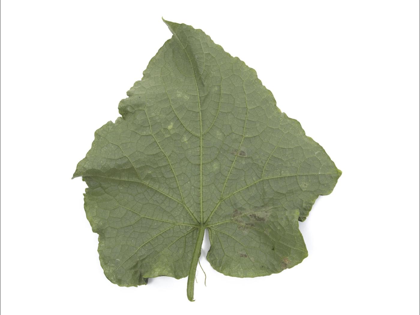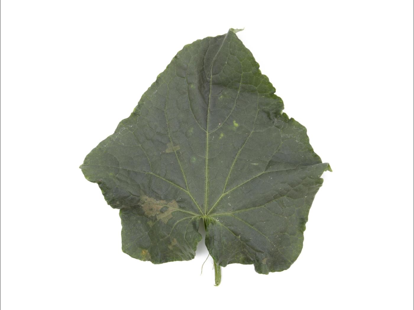 Description: Sur la face supérieure d’une feuille de concombre de serre, présence de petites taches jaunâtres qui correspondent à un début d'infection par le mildiou. On observe aussi des taches brunes et angulaires de plus grande taille (1 à 2 cm de diamètre) un symptôme de la maladie parvenue à un stade plus avancé. Un duvet gris et poudreux est observé sous ces lésions.