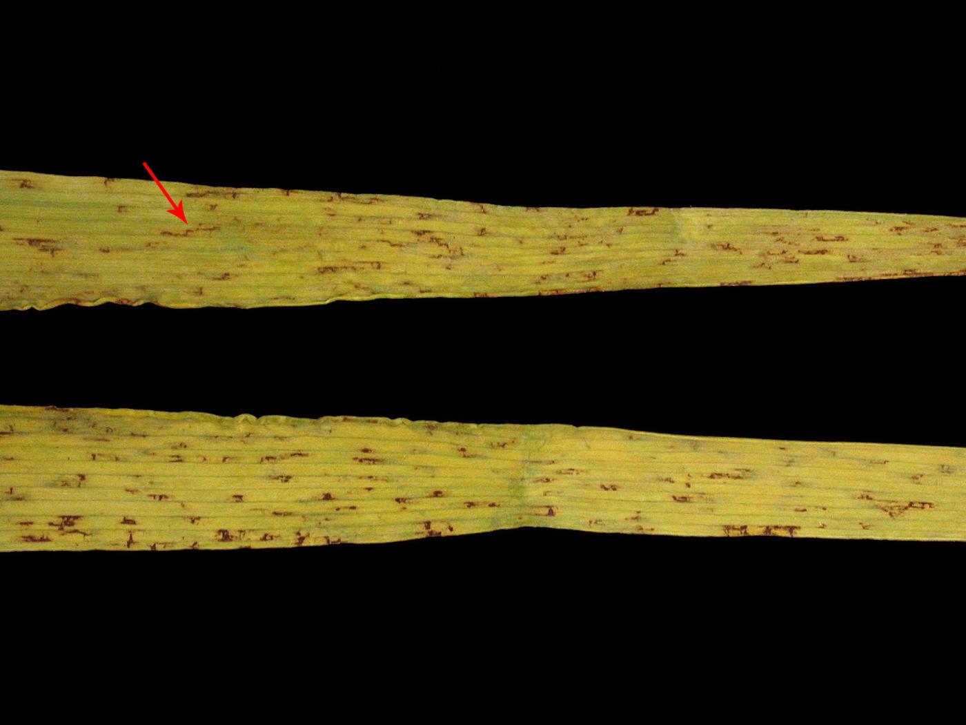 Description: Sur des feuilles d’orge (cv 'Béluga'), présence de taches allongées, étroites et brunes. Sur la feuille du haut, les taches commencent à former des stries longitudinales brunes (voir flèche). Les tests de laboratoire ont révélé la présence du champignon Pyrenophora teres, responsable de la rayure réticulée chez l’orge.