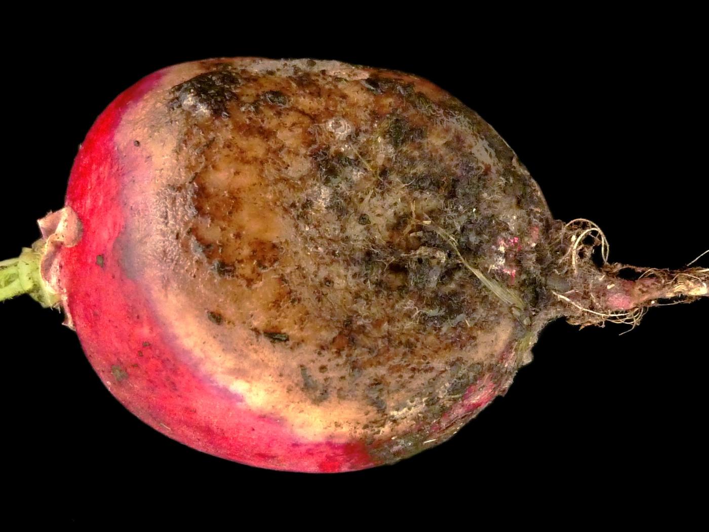 Racine : les tissus affectés sont brun noir à noir et à mesure que la maladie se développe, des lésions et des fentes peuvent apparaître et pénétrer plus profondément dans les tissus. Le champignon peut affecter les racines à différents endroits. La délimitation des tissus sains et affectés est nette et apparaît souvent par une ligne brun foncé à noire.