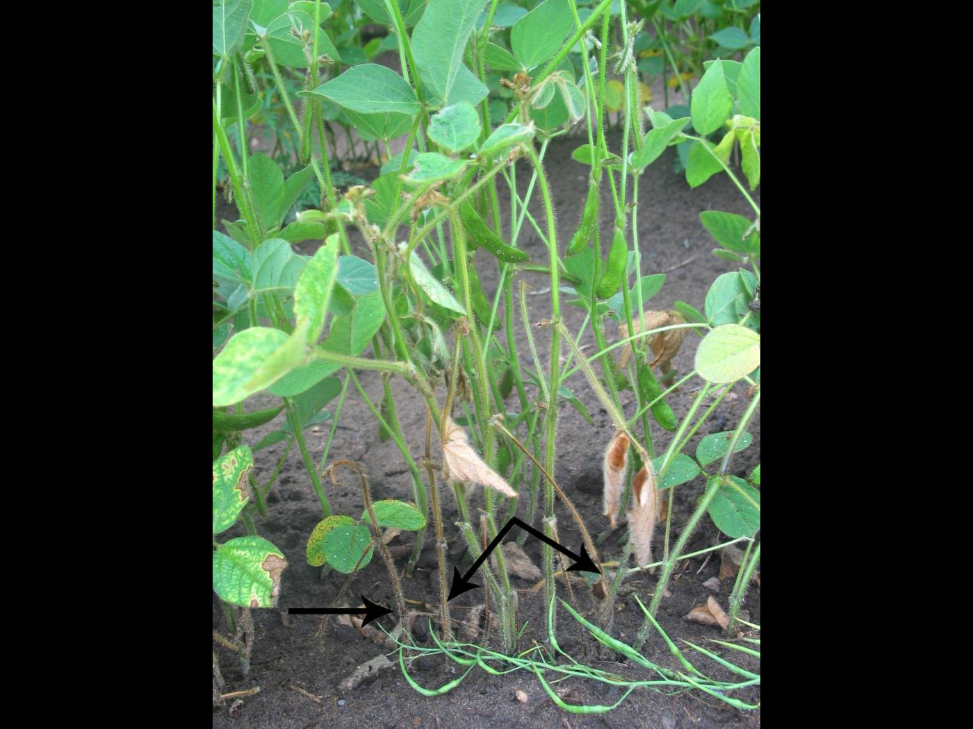 Tige : présence d’une coloration rougeâtre à brunâtre, sèche et ferme dans la partie basale de la tige, près du sol. Les plants matures montreront des chancres ou des bandes rougeâtres à brunâtres. Parfois présence d’un mycélium brun ou de petits sclérotes bruns à noirs.
