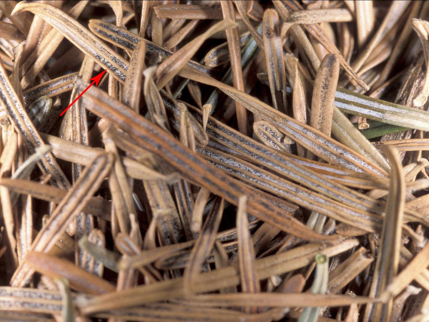 Description: Des aiguilles de sapin baumier brunes montrent, à la face inférieure, des fructifications noires sous la forme de lignes noires (voir flèche). Les tests de laboratoire ont révélé la présence de pycnides et de conidies du champignon Rhizosphaera sp., responsable des rouges des conifères. Il s’agit probablement de Rhizosphaera kalkhoffii, une espèce rapportée chez le sapin.