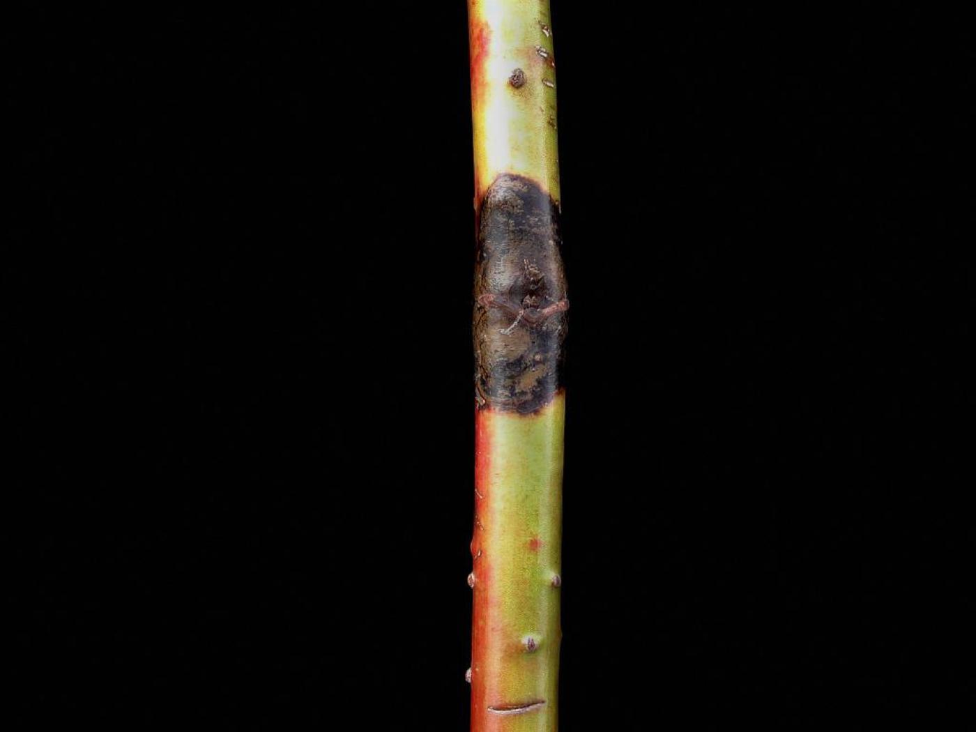 Tige : présence de chancres bruns à noirs, superficiels et qui encerclent partiellement ou totalement la tige. Une bordure rouge délimite parfois le chancre sur l’épiderme.
