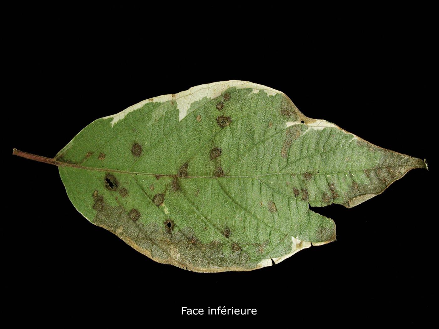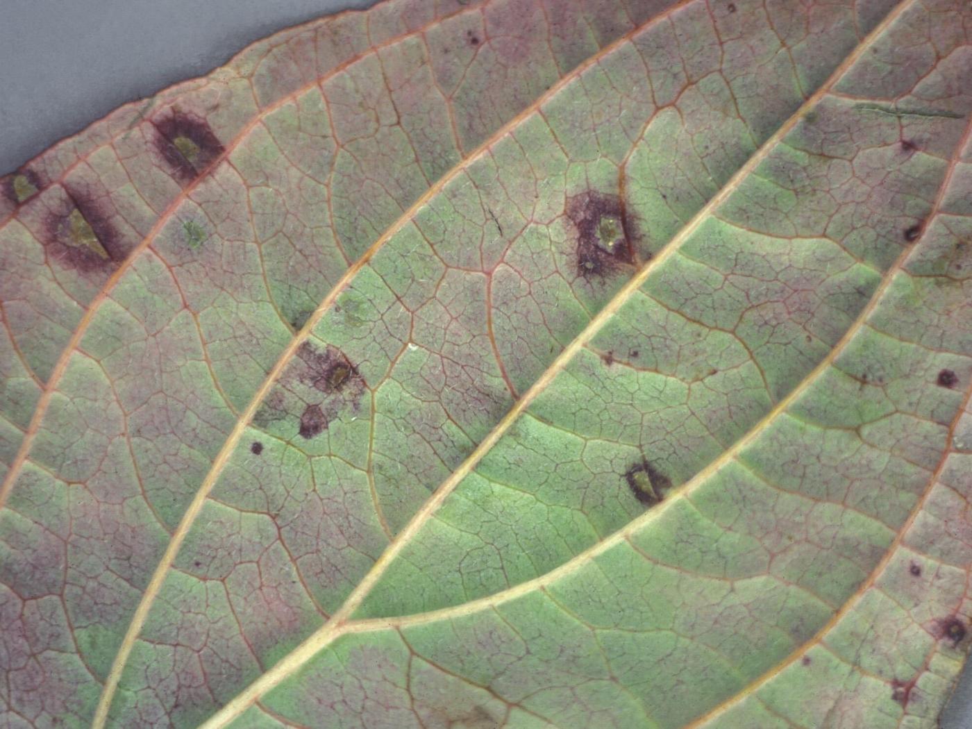 Description: À la face inférieure d’une feuille de cornouiller provenant d’une pépinière, présence de taches circulaires à angulaires, brun gris avec une large marge pourpre. Elles sont situées près des nervures. Les tests de laboratoire ont révélé la présence du champignon Septoria cornicola, responsable de la tache septorienne.