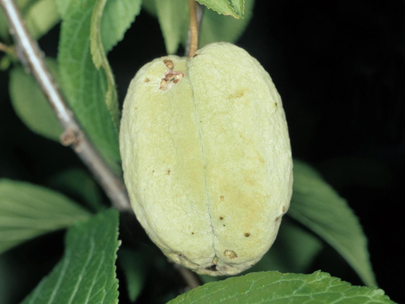 Fruit : au début, présence de petites cloques blanches qui s’agrandissent rapidement avec le développement du fruit pour finalement couvrir tout l’épiderme. La croissance d’un fruit affecté est environ 10 fois plus rapide que celle d’un fruit sain. Le fruit est gros, déformé et aplati avec des invaginations. La chair est spongieuse et sans noyau, laissant une cavité creuse (pochette). Au début, le fruit est jaune puis devient rapidement rougeâtre et se couvre d’une poudre blanchâtre à grisâtre (fructifications fongiques). Une fois les spores dispersées, le fruit brunit, se ratatine et tombe au sol. Il n’est plus comestible.