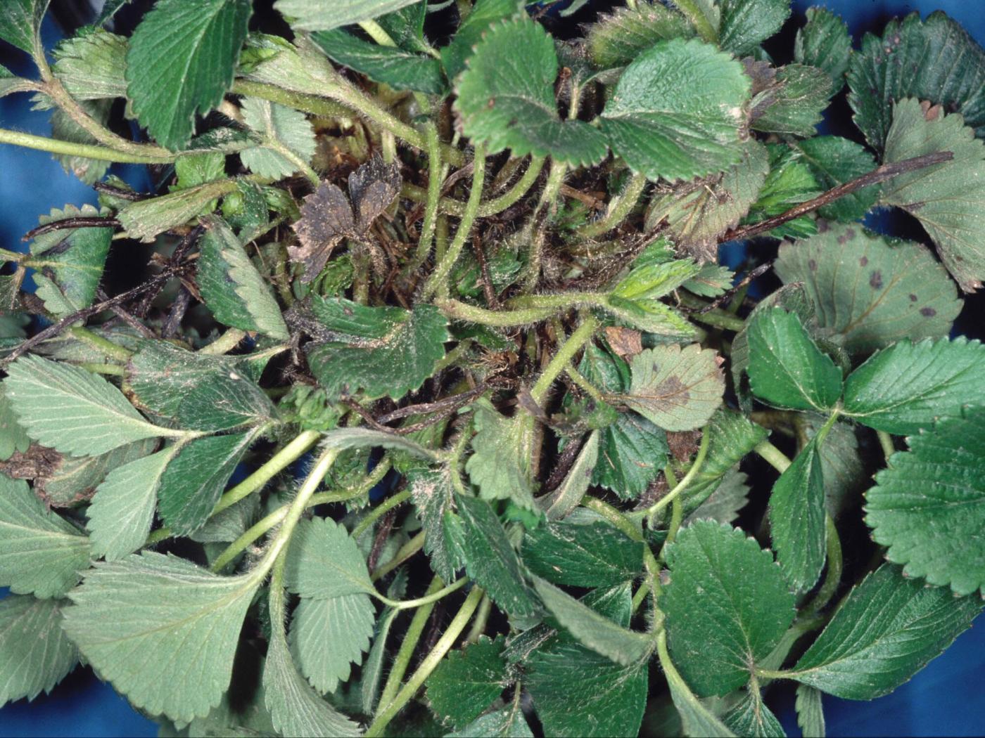 Description: Le fraisier (cv 'Jewel') présente une importante malformation qui se caractérise par la présence de multiples collets accolés les uns sur les autres. Les feuilles sont nombreuses et petites. Ces symptômes sont caractéristiques de la maladie des collets multiples causée par un phytoplasme.