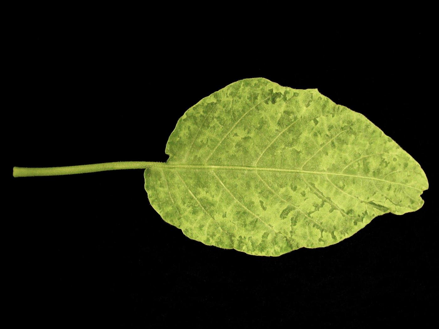 Description: Face supérieure des feuilles de brugmansia. Présence de sévères mosaïques vert pâle à vert foncé, distribuées au hasard sur le limbe mais parfois, semble débuter à la marge. Certaines feuilles présentent des anneaux vert pâle avec un centre foncé. Les feuilles médianes et terminales sont les plus touchées. Les tests de laboratoire ont révélé la présence d’un virus appartenant au groupe des Potyvirus. Dans la serre, 25 % des plants sont affectés.