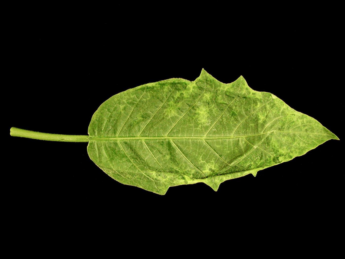 Feuille : présence de jaunissement, de mosaïques ou marbrures, de taches jaunes ou en anneaux, d’une décoloration des nervures, de stries en bandes parallèles aux nervures, de nécroses ou de déformations (pustules vert foncé entre les nervures, gaufrage, feuilles enroulées en forme de cuillère, tordues, etc.).