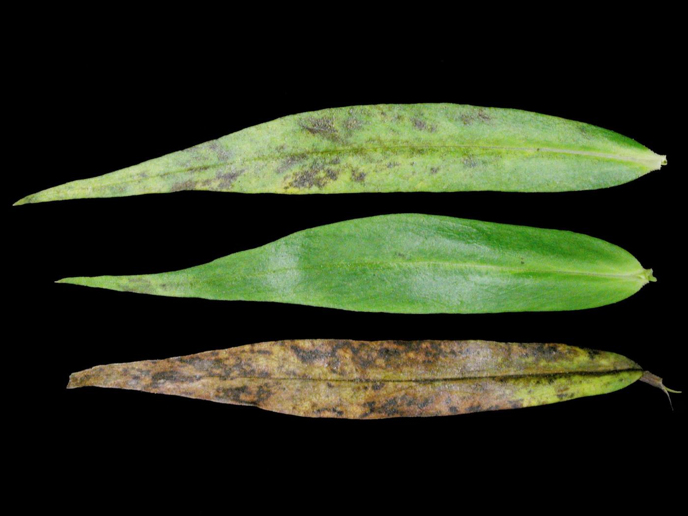 Feuille : présence de jaunissement, de mosaïques ou marbrures, de taches jaunes ou en anneaux, d’une décoloration des nervures, de stries en bandes parallèles aux nervures, de nécroses ou de déformations (pustules vert foncé entre les nervures, gaufrage, feuilles enroulées en forme de cuillère, tordues, etc.).