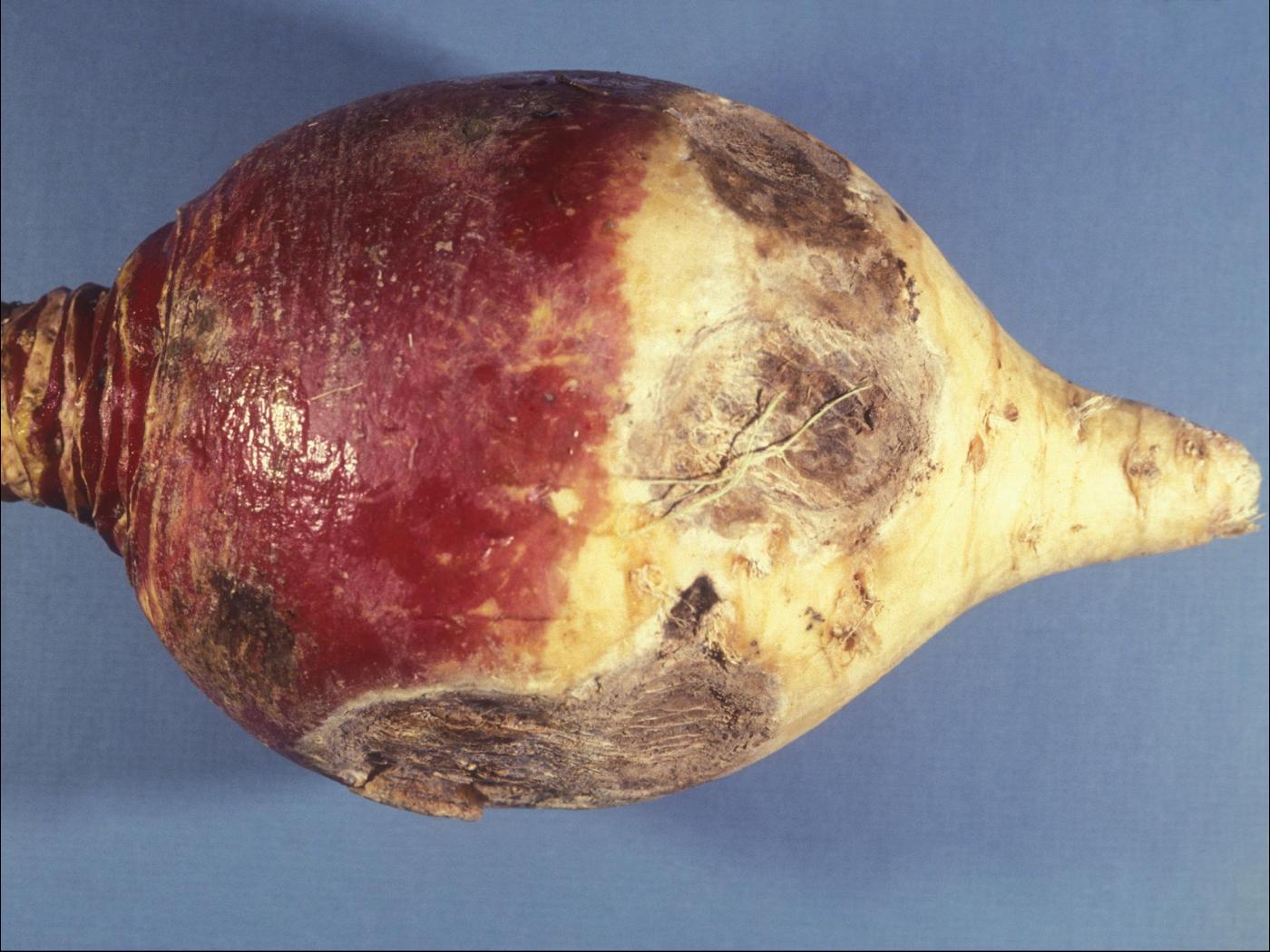 Racine : présence de taches noires dépressives sur l’épiderme. Chez le rutabaga, la racine peut être de petit calibre et rabougrie. Les symptômes racinaires apparaissent lorsque les plantes sont infectées au début de leur croissance.