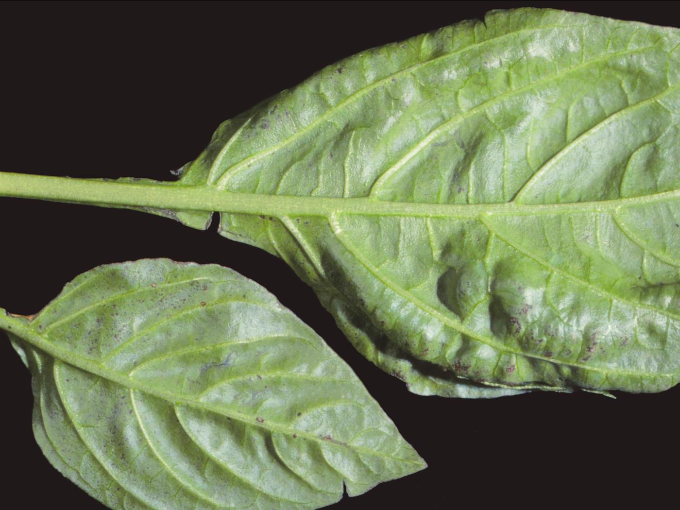 Description: Des feuilles de poivron de serre montrent de petites taches nécrotiques à la face inférieure. Les feuilles sont gaufrées. Les tests de laboratoire ont révélé la présence du virus de la maladie bronzée de la tomate (TSWV).