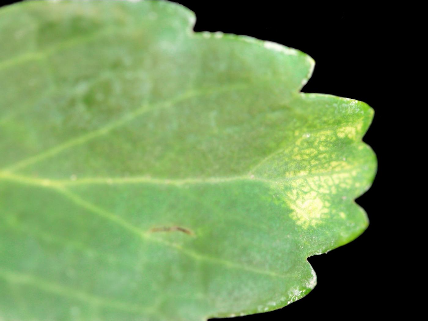 Feuille : sur les jeunes feuilles, présence de mosaïques, de marbrures, de taches jaunes ou blanches, en anneaux ou non, ou d’un jaunissement entre les nervures. Occasionnellement, présence de déformation. Les vieilles feuilles peuvent montrer des taches ou des nervures nécrotiques.