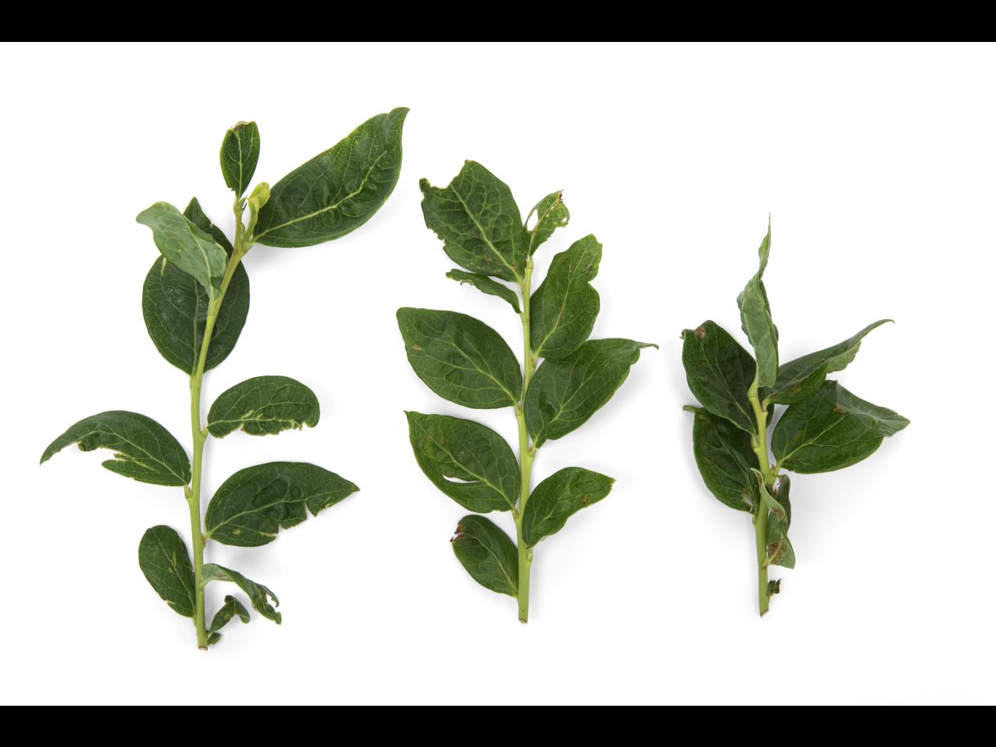 Description: Sur ce plant de bleuet en corymbe (cv. Duke) co-infecté par le virus latent du bleuet (BBLV) et le virus de la mosaïque du bleuet (BlMaV), on observe des malformations importantes au niveau des feuilles. Les nervures principales sont sinueuses, ce qui donne un aspect froissé aux feuilles. Les nervures secondaires réticulées sont élargies et claires. Ce symptôme n'est pas typique d'une infection causée par le BlMaV.
