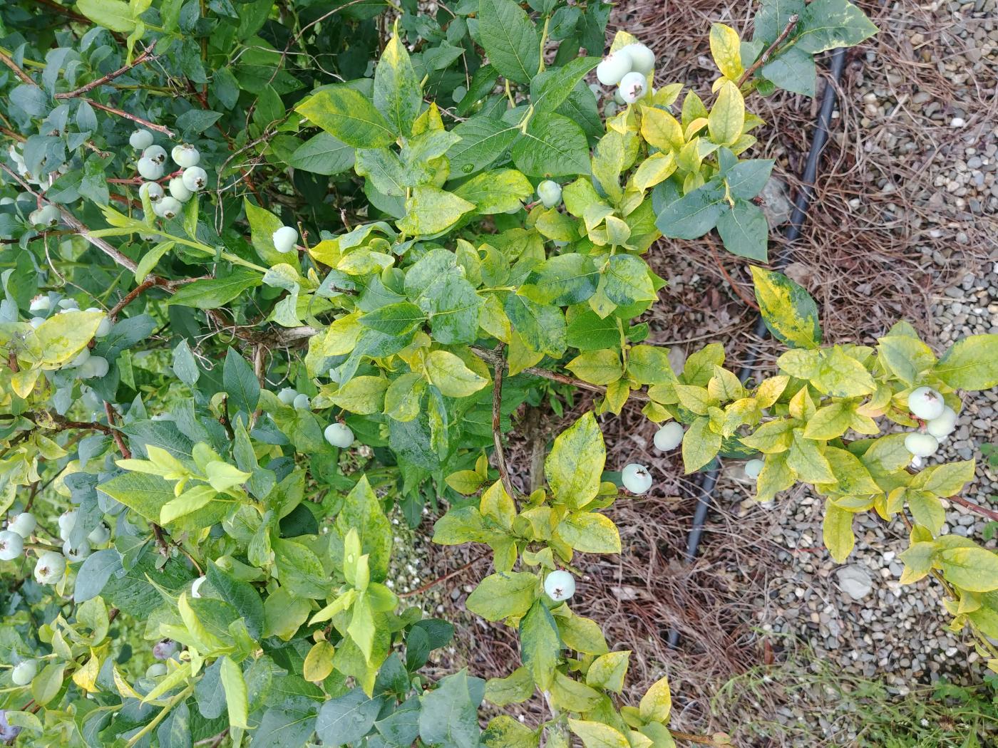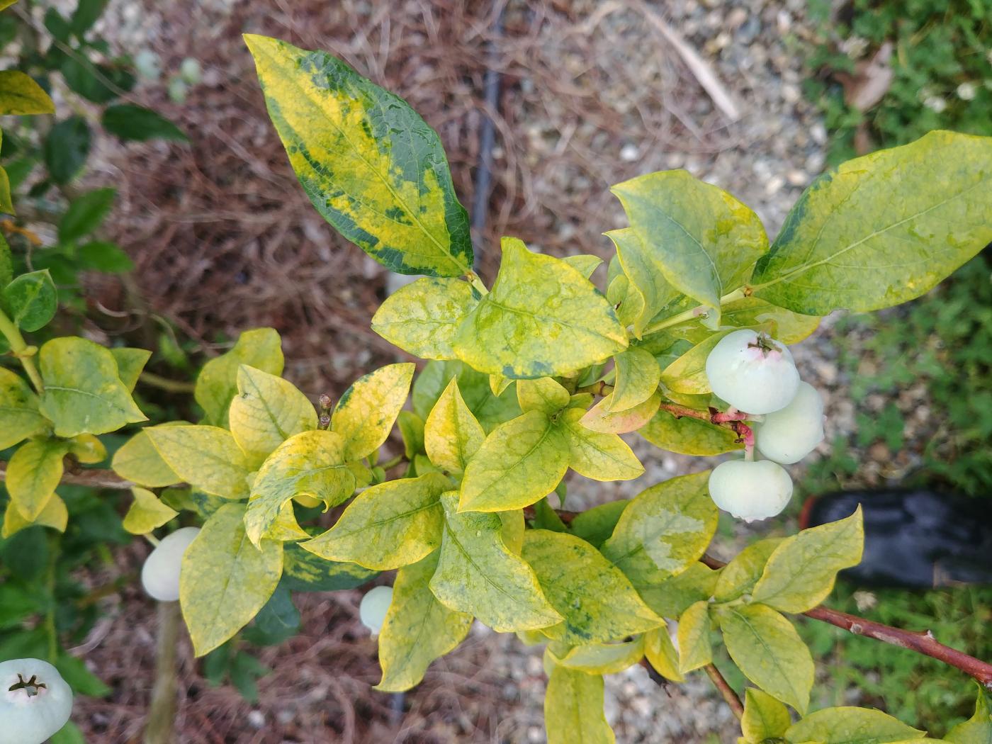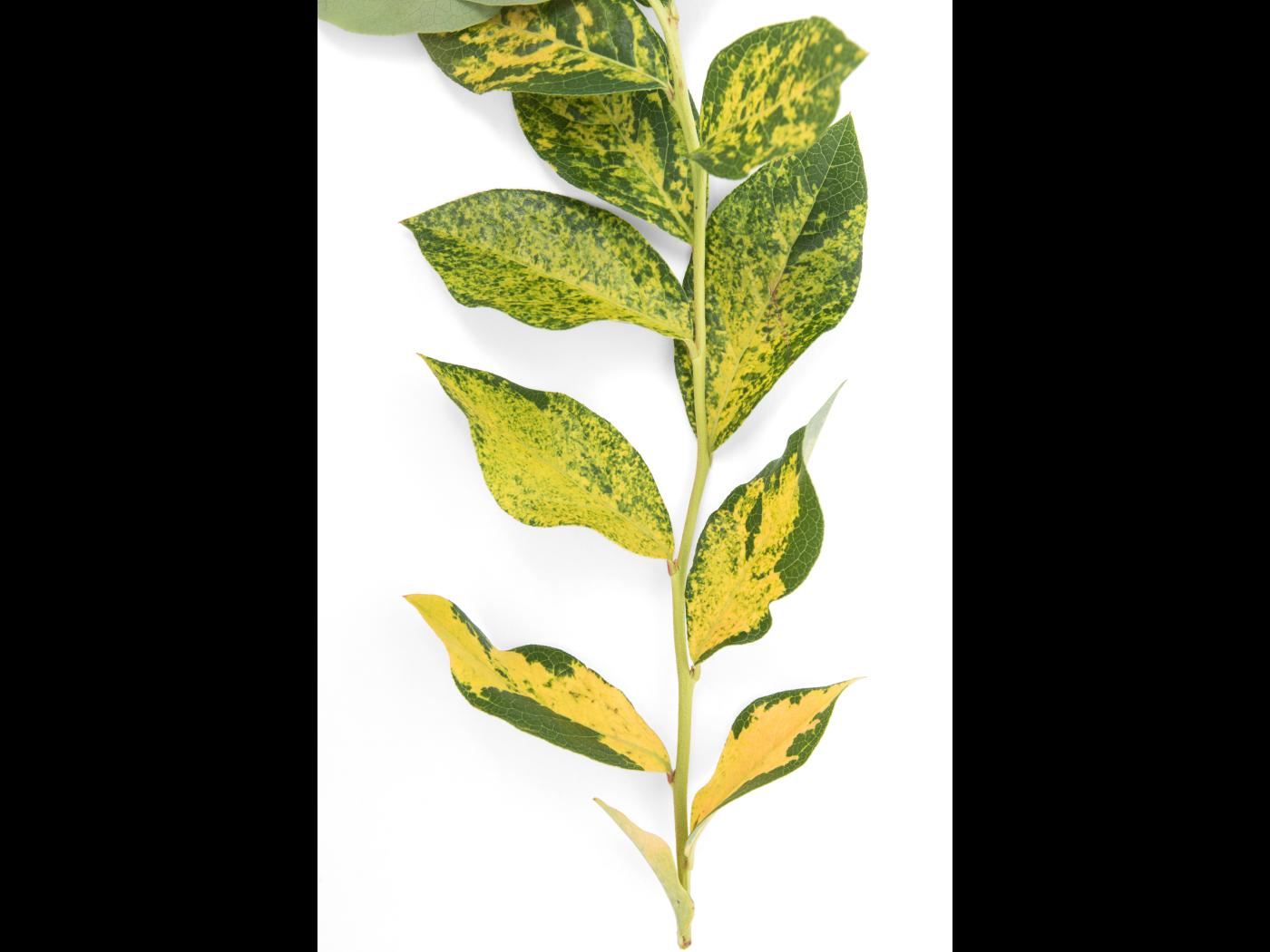 Description: Bleuetier (cv. Patriot) co-infecté par le virus de la mosaïque du bleuet (BlMaV), le virus latent du bleuet (BBLV) et le virus A du bleuet (BVA). L'échantillon a été prélevé au début du mois de juillet dans une parcelle en production conventionnelle. Les feuilles présentent d'importantes mosaïques jaune et vertes.
