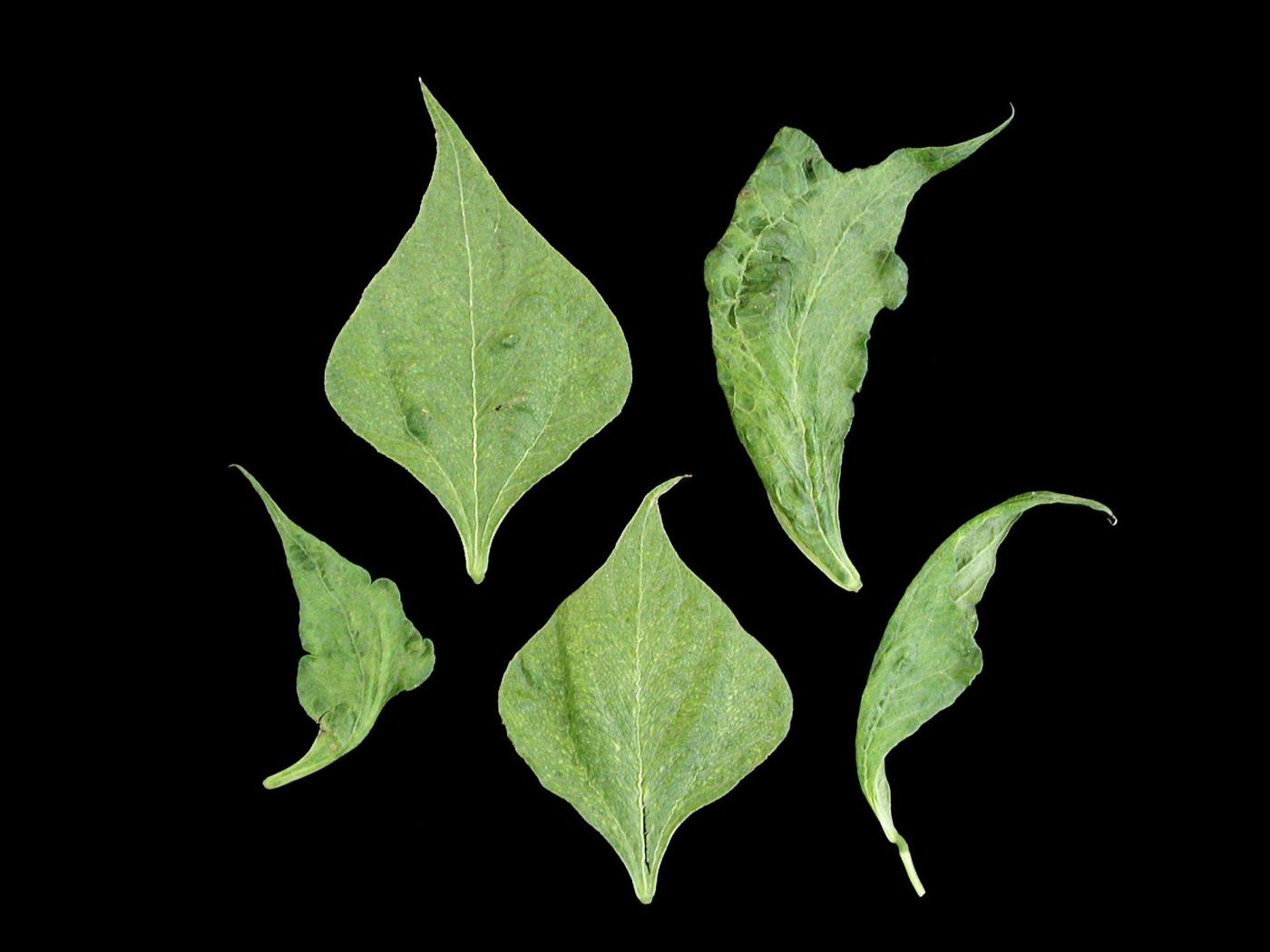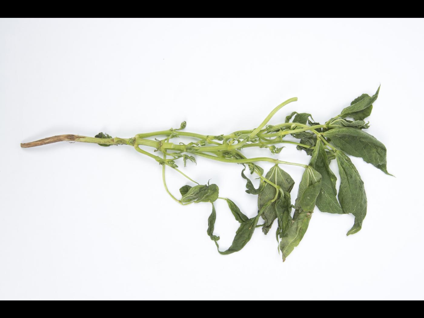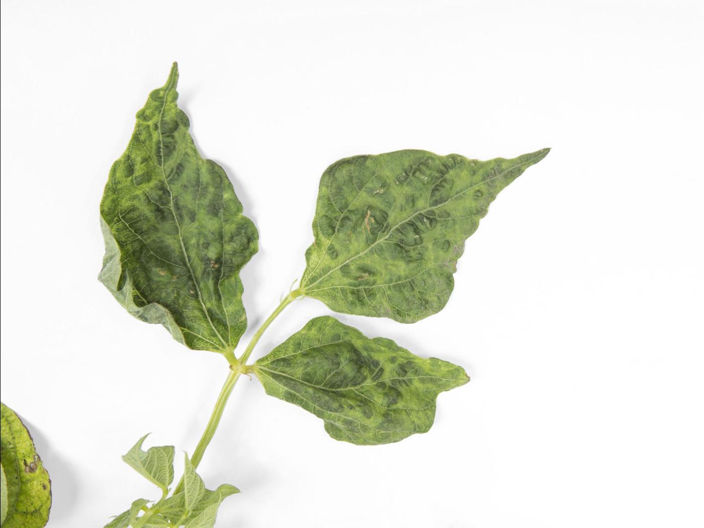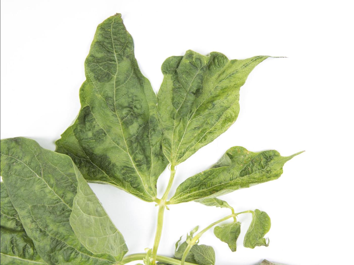 Feuille : au début, les feuilles sont courbées vers le bas (épinastie) et une mosaïque est observée sur quelques feuilles. Les feuilles développent plus tard une mosaïque jaune-vert, du gaufrage, un enroulement de la marge des feuilles, des déformations sévères et une rugosité le long des nervures (aspect de "zipper").