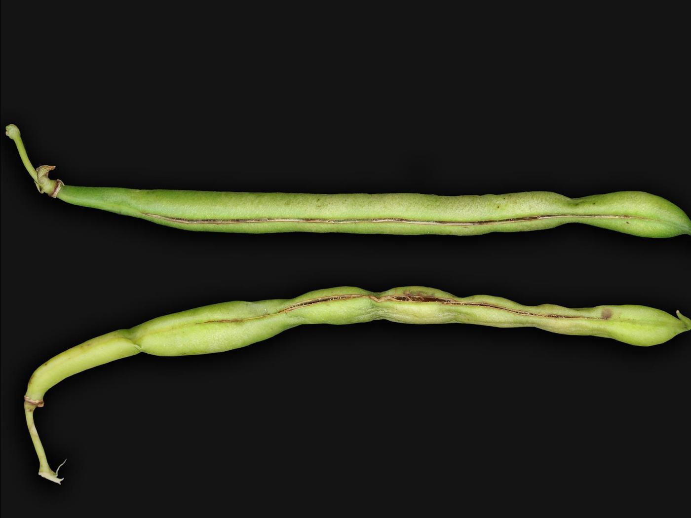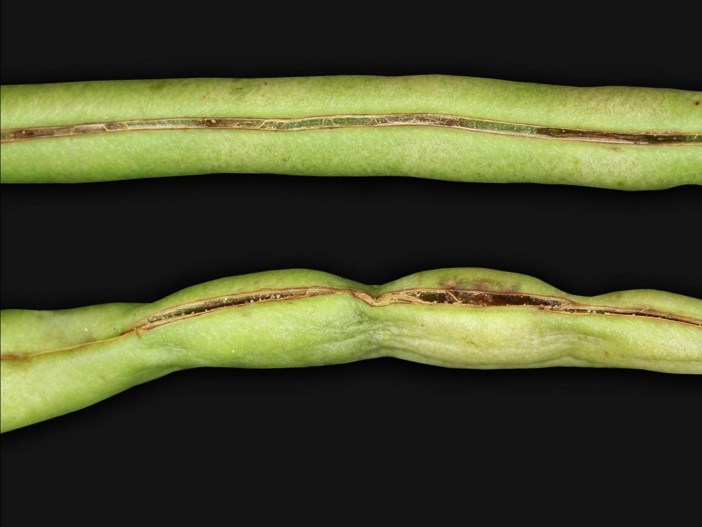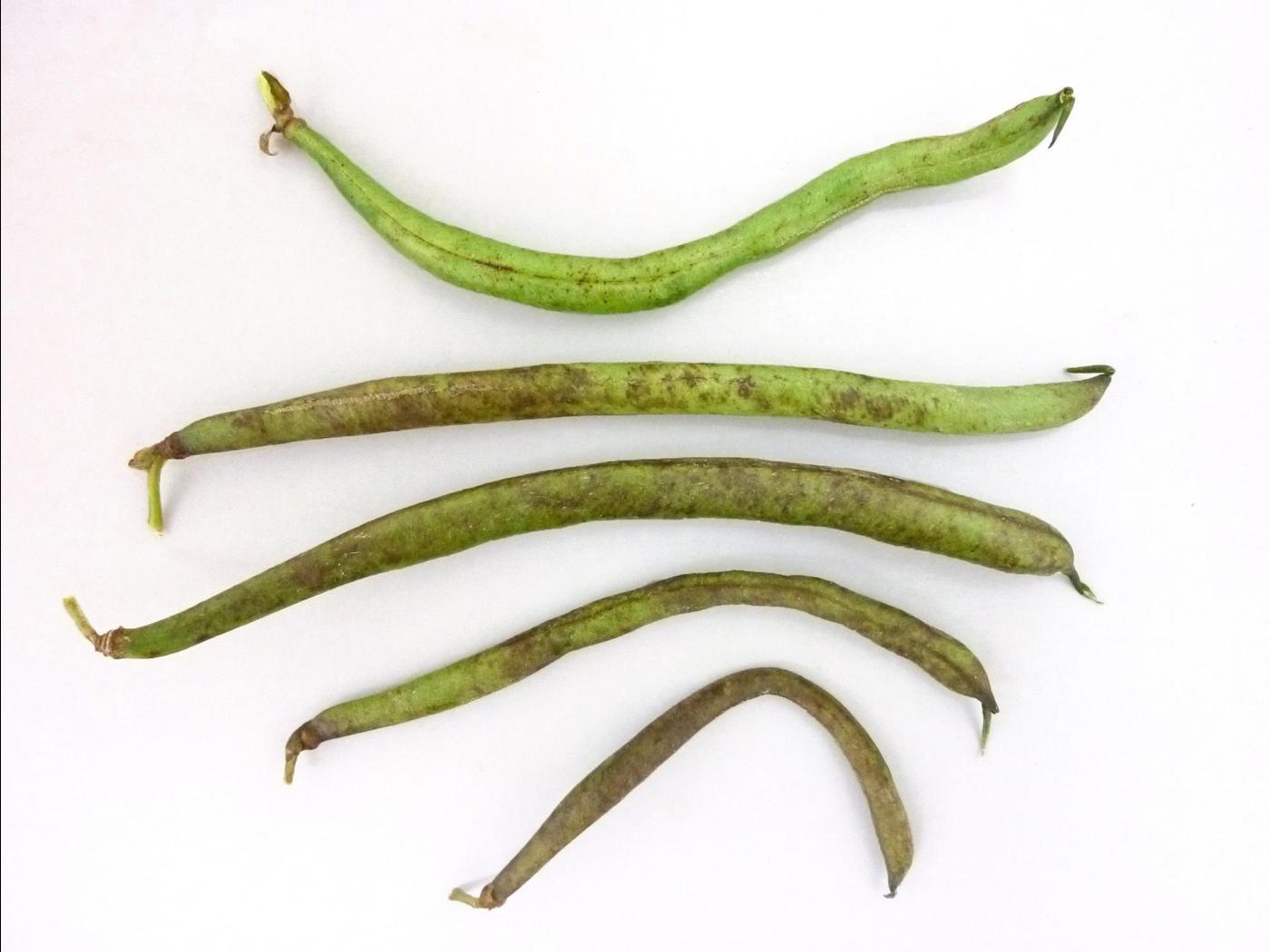 Gousse : les gousses sont courbées et tachetées. Diminution du calibre des gousses.