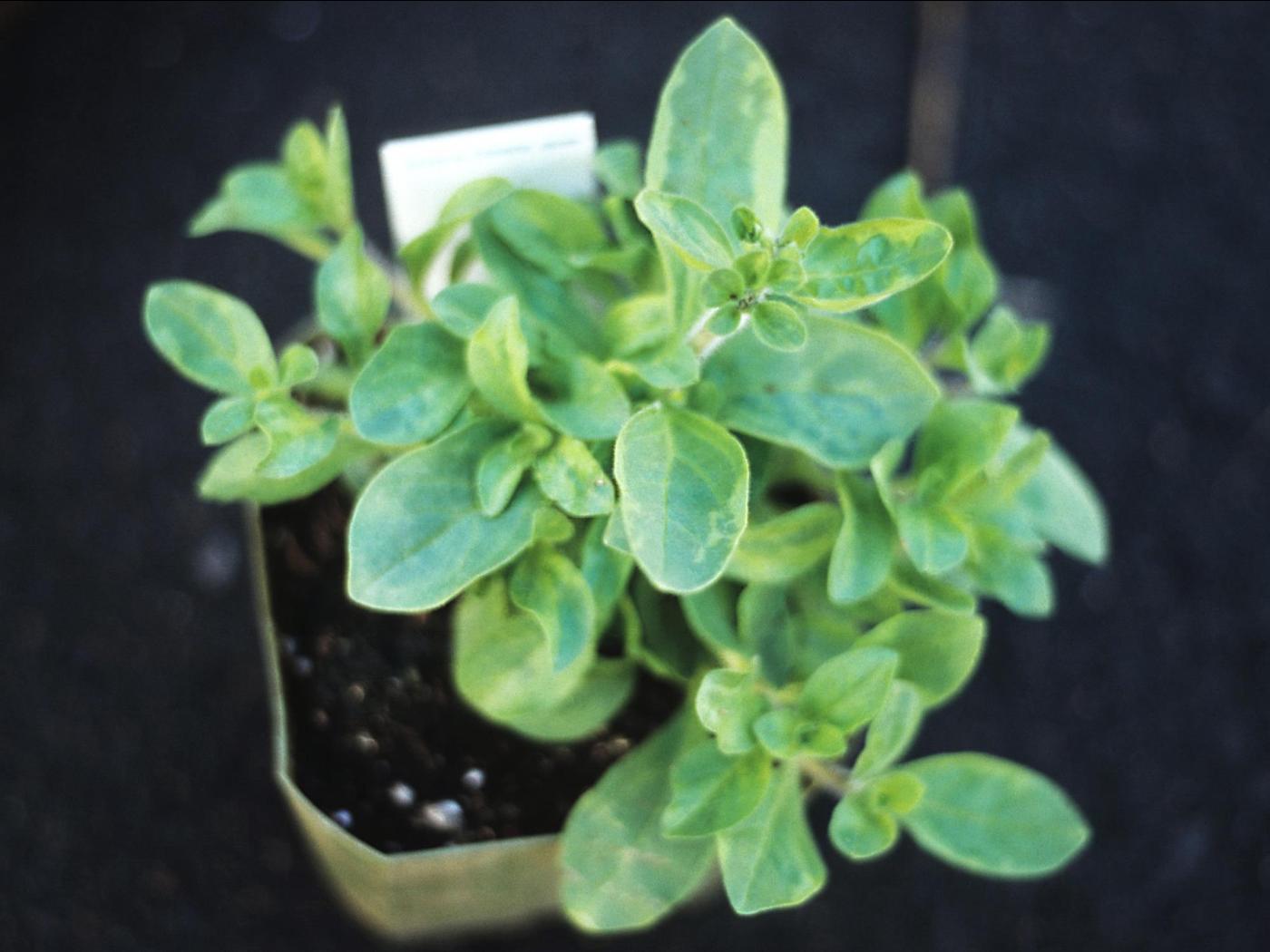 Description: Sur les feuilles terminales de plants de surfinias, présence d’une mosaïque (plages irrégulières vert pâle à jaunes), d’un gaufrage léger du limbe et d’une marge enroulée vers le haut, en forme de cuillère. Les très jeunes feuilles sont étroites et filiformes. Les tests de laboratoire ont révélé la présence du virus de la mosaïque du concombre (CMV).