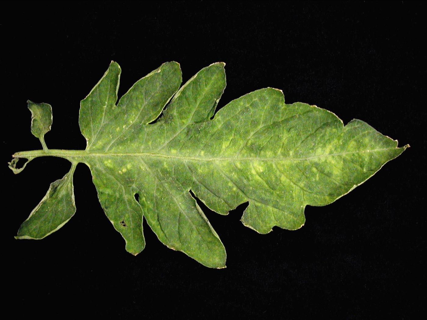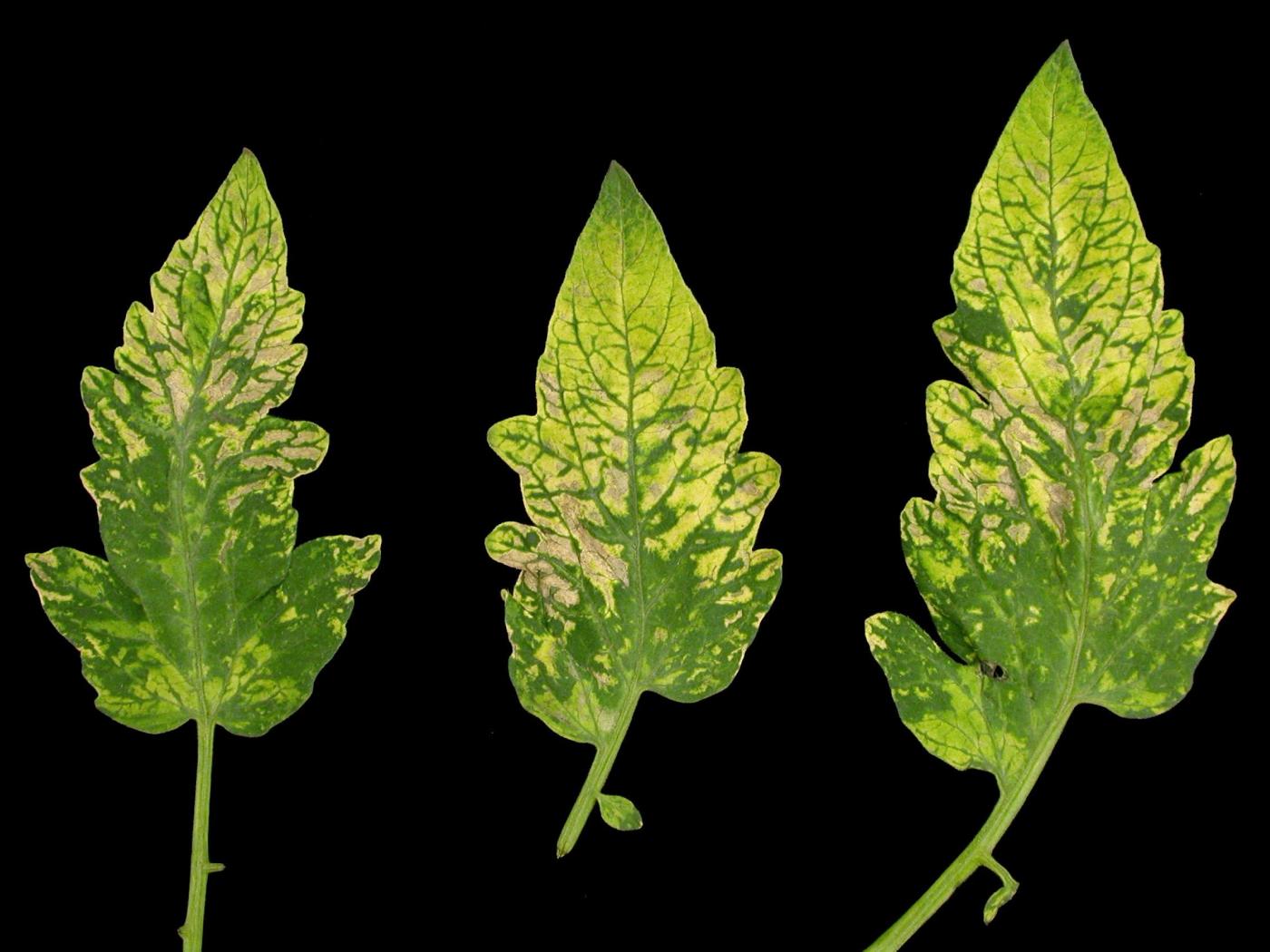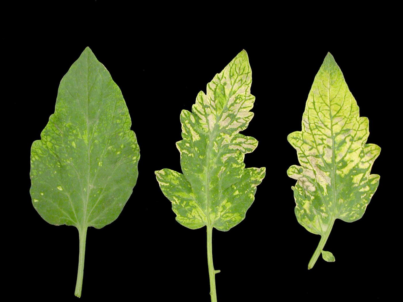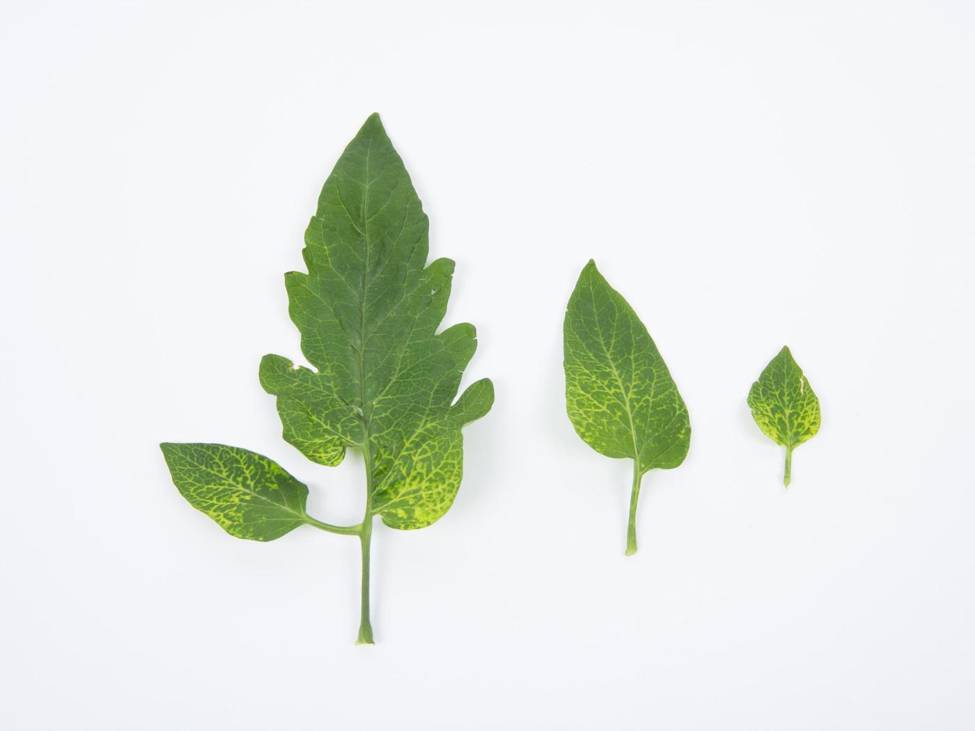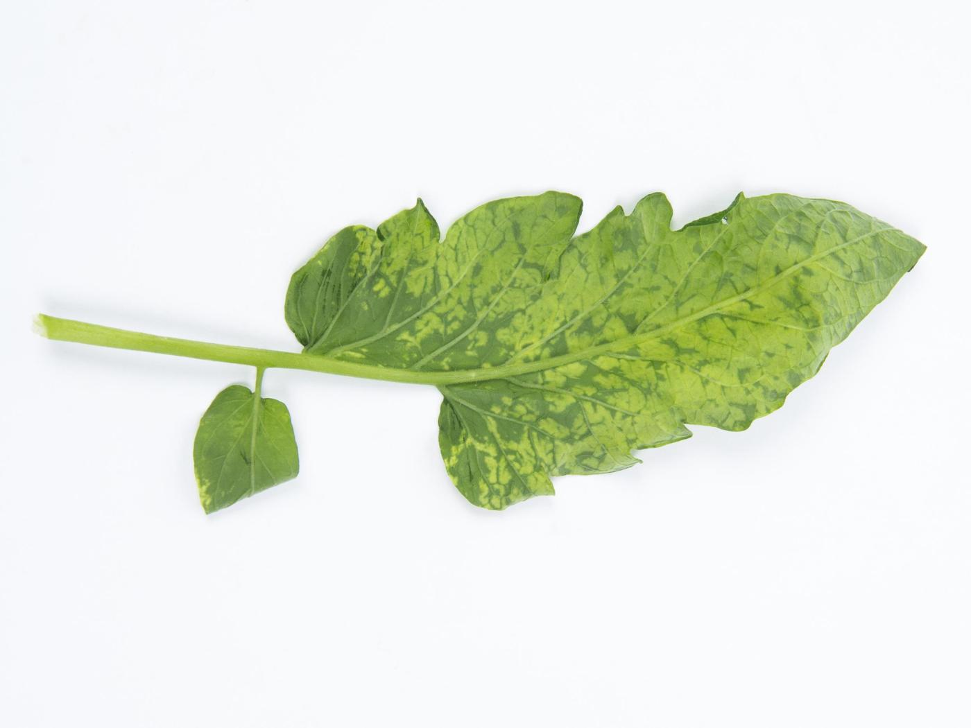 Feuille : présence de mosaïques jaunes plus ou moins sévères et de petites taches jaunes sur les jeunes feuilles. Plus tard, des mosaïques d’un jaune vif et des taches nécrotiques peuvent apparaître sur les vieilles feuilles. Les feuilles peuvent montrer des malformations sévères en période de faibles intensités lumineuses (folioles étroites et découpées, apex acuminé, feuilles gaufrées, énation). Quelques souches de PepMV causent des nécroses sévères ou des stries brunes sur les pétioles et peuvent les cerner complètement.